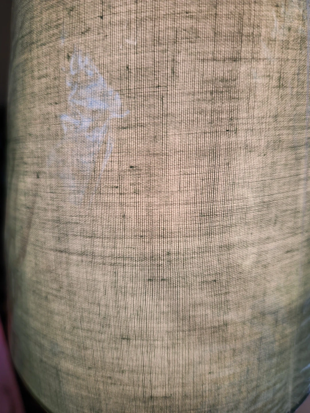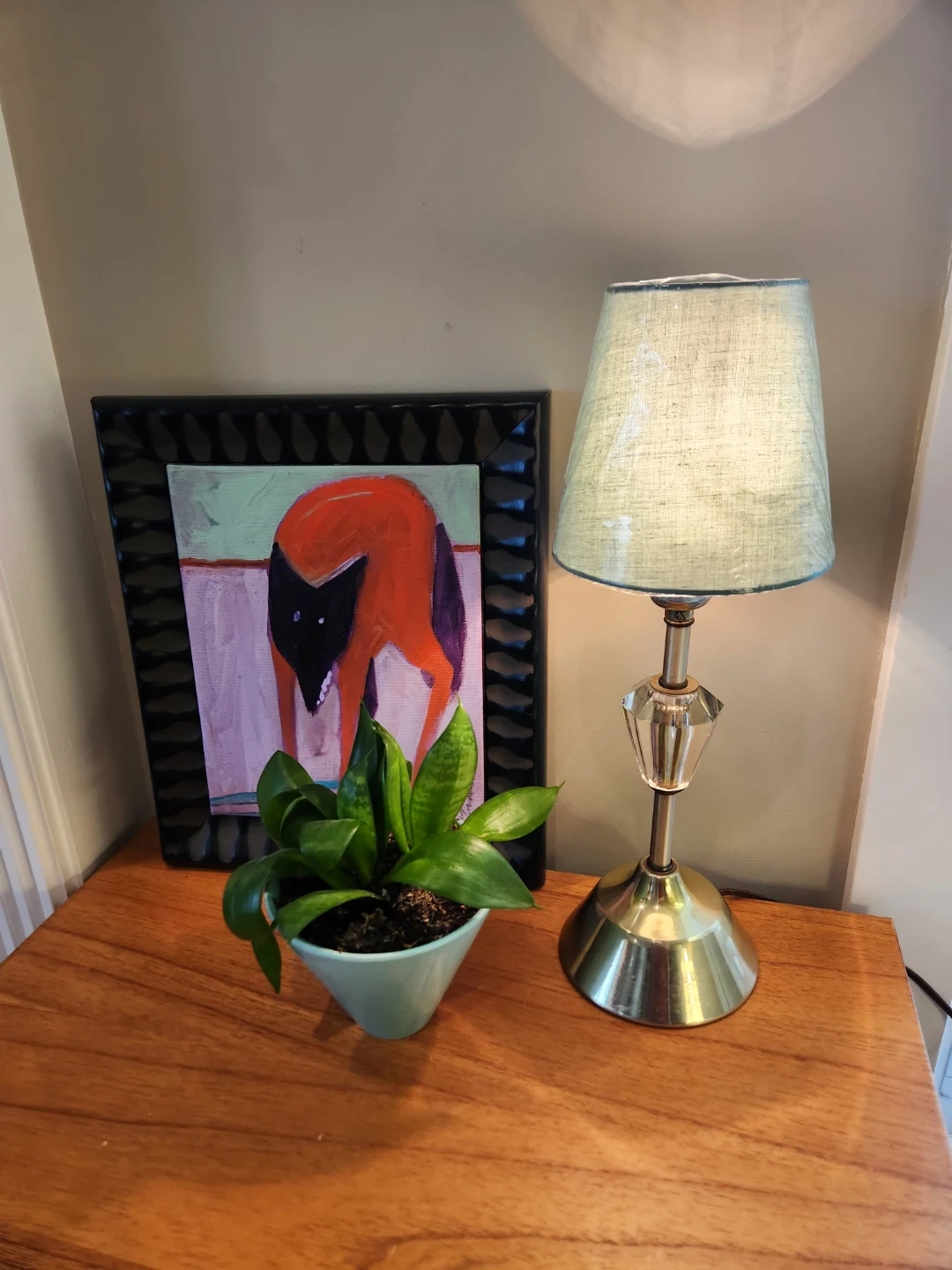 This 1940s micro lamp with a brushed metal base and a decorative crystal style accent. It has a soft green textured fabric lampshade and plenty of vintage style! . Adds great ambient light to a bedroom or living space. 16 inches high, with a 6 inch diameter base makes this piece particularly handy for night stands, mantle, entryways of bookshelves! HANDY & HANDSOME.
