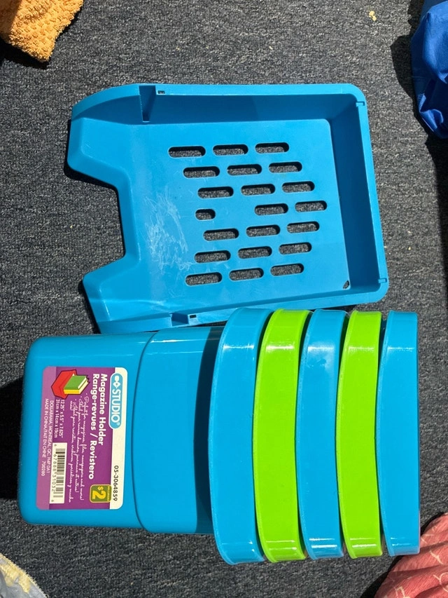 Keep your reading materials organized with this Studio magazine holder, featuring a durable plastic construction and a vibrant blue and green colour scheme. As a previously enjoyed item, it shows some signs of use, but remains fully functional and ready to tidy up your space. Dimensions are 12.25" x 5.5" x 7.625".