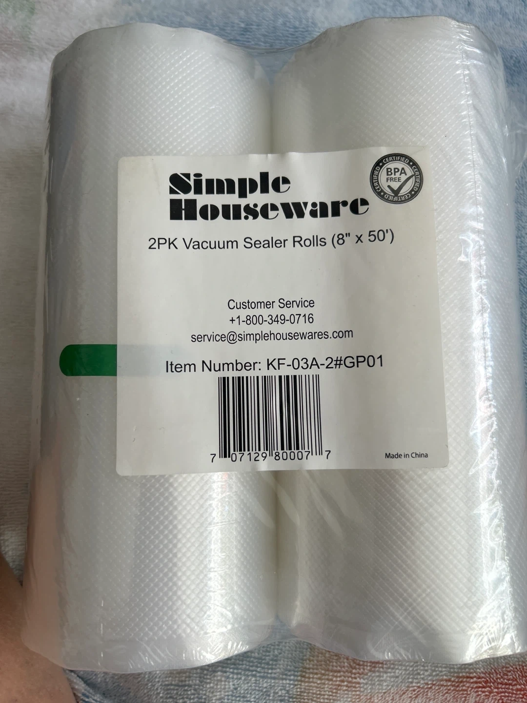 Selling a set of Simple Houseware vacuum sealer rolls. This is a 2-pack, and each roll measures 8 inches by 50 feet. They're BPA-free and ready to help you keep your food fresh!
