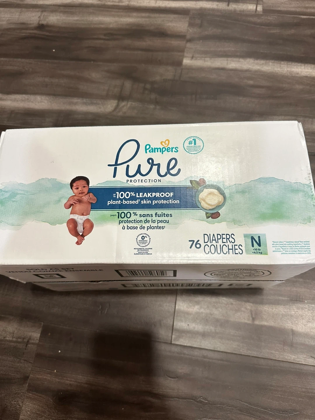 Pampers Pure Protection diapers offer 100% leakproof protection with plant-based skin protection. These are size N diapers, suitable for babies under 10 lbs or 4.5 kg. They contain 0% parabens, allergens, elemental chlorine, and perfume. The pack includes 76 diapers.