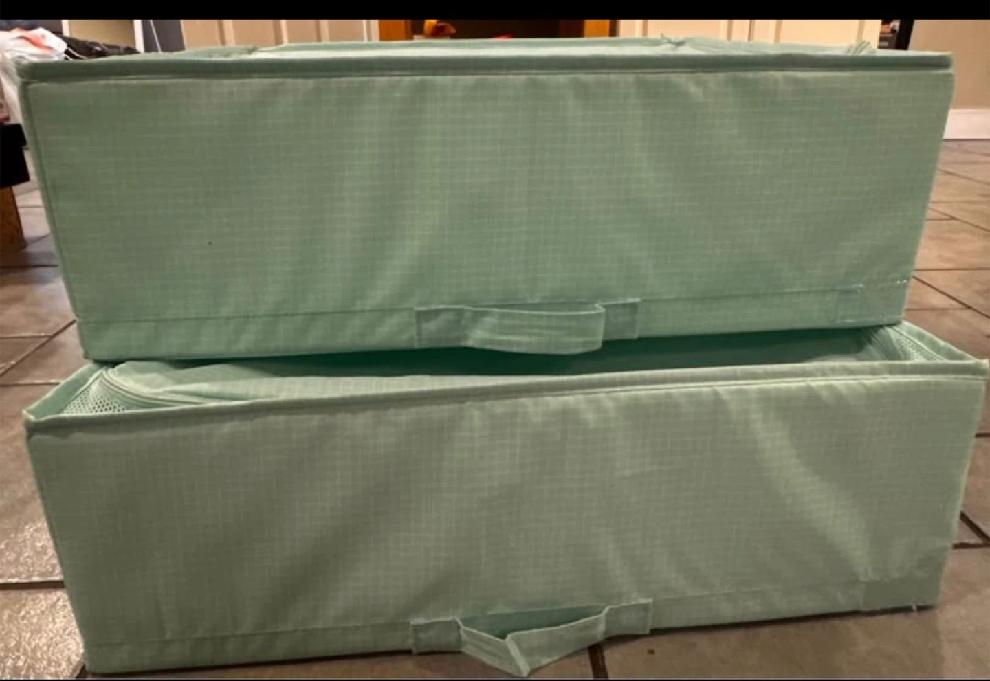 A set of 1sturdy white plastic clothes hangers with a smooth finish. It also includes two light green fabric storage bins with zippered tops and mesh accents. These bins are great for organizing closets or drawers!