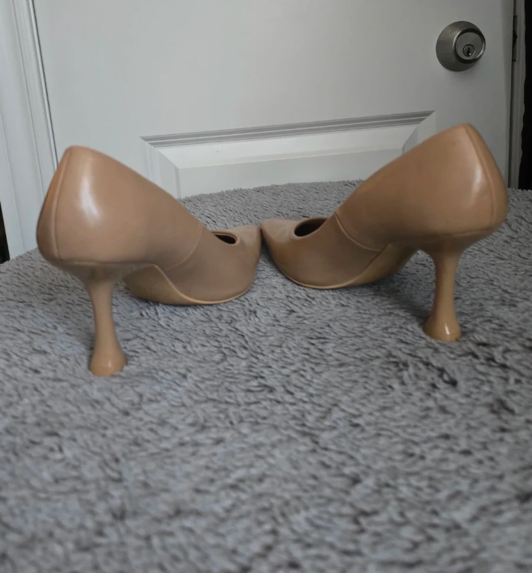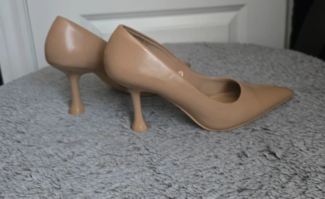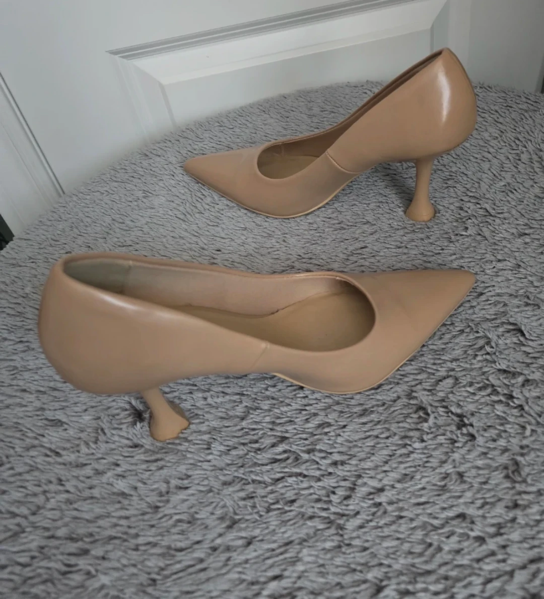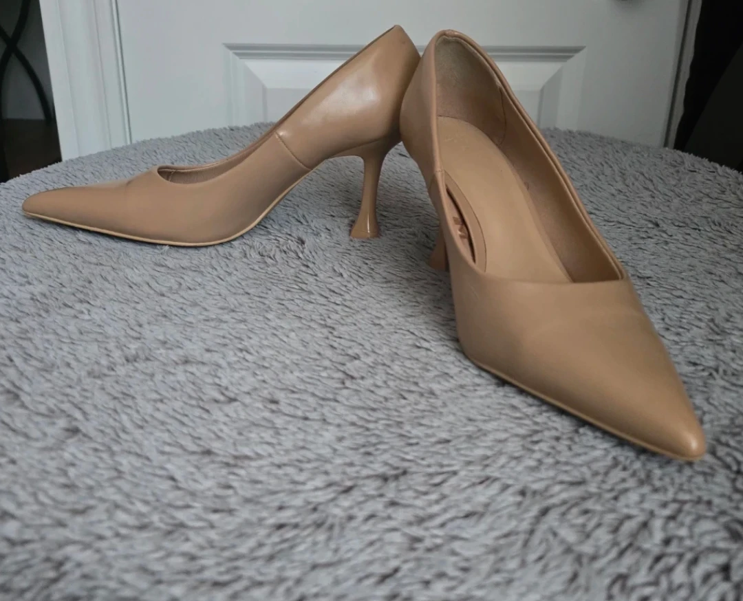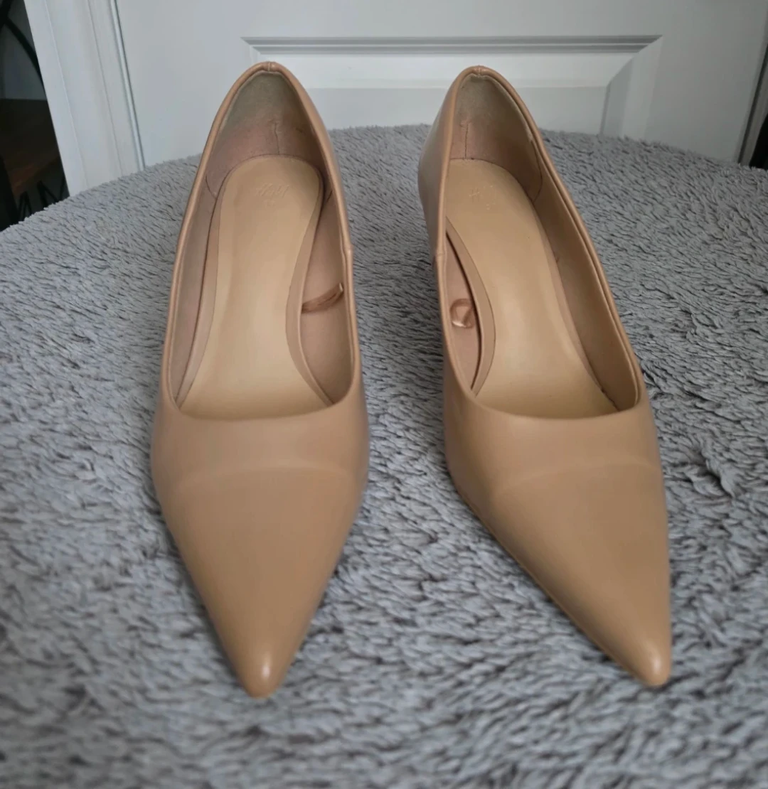 Classic tan pointed-toe heels from H&M. These pumps have a unique sculpted heel and a slip-on design. Material appears to be faux leather.