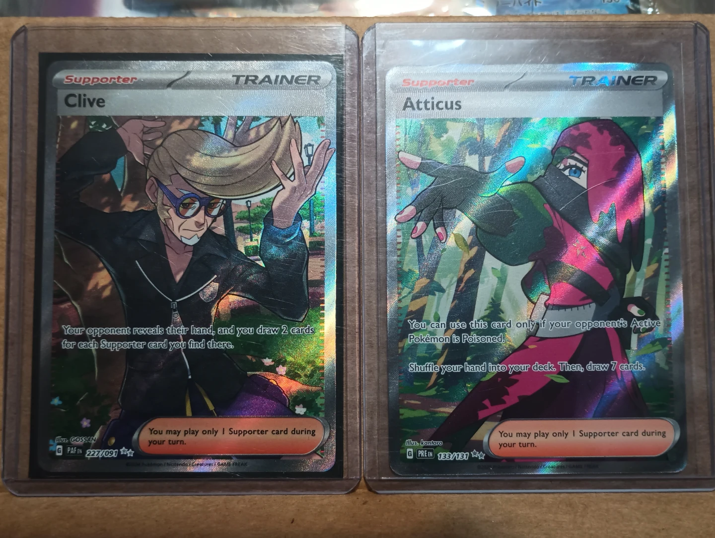 Selling two Pokemon Trading Card Game Trainer cards. Includes Clive (227/091) and Atticus (133/131). These are supporter cards for gameplay. They're holographic.