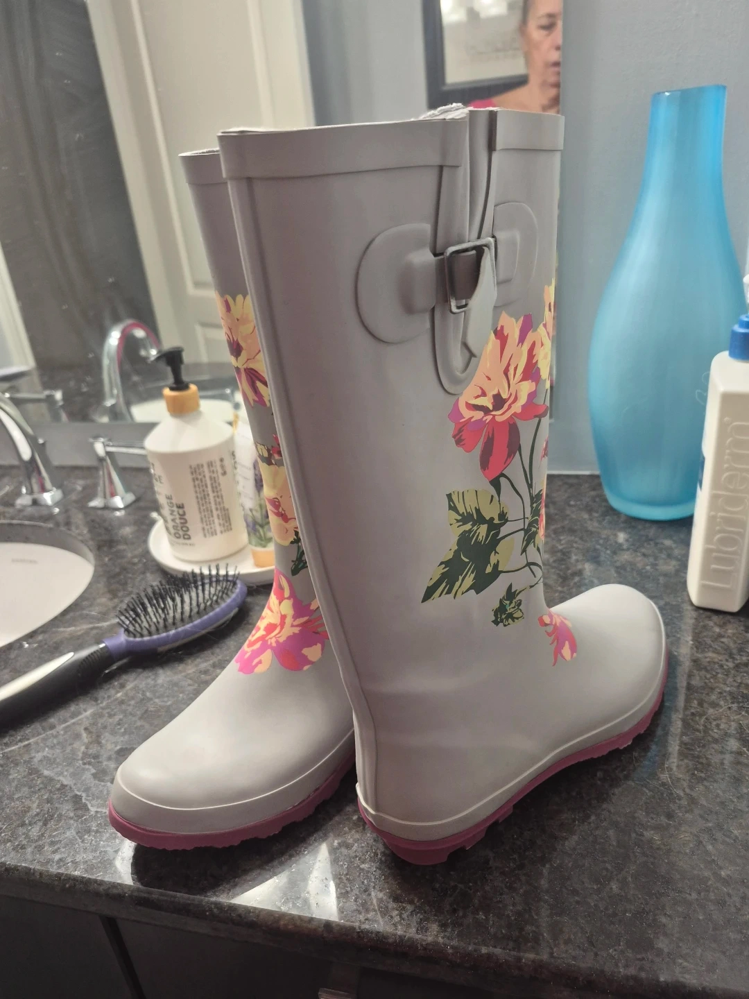 These rain boots are perfect for those wet Canadian days! They're a stylish grey with a lovely floral pattern and pink soles. Size 8.