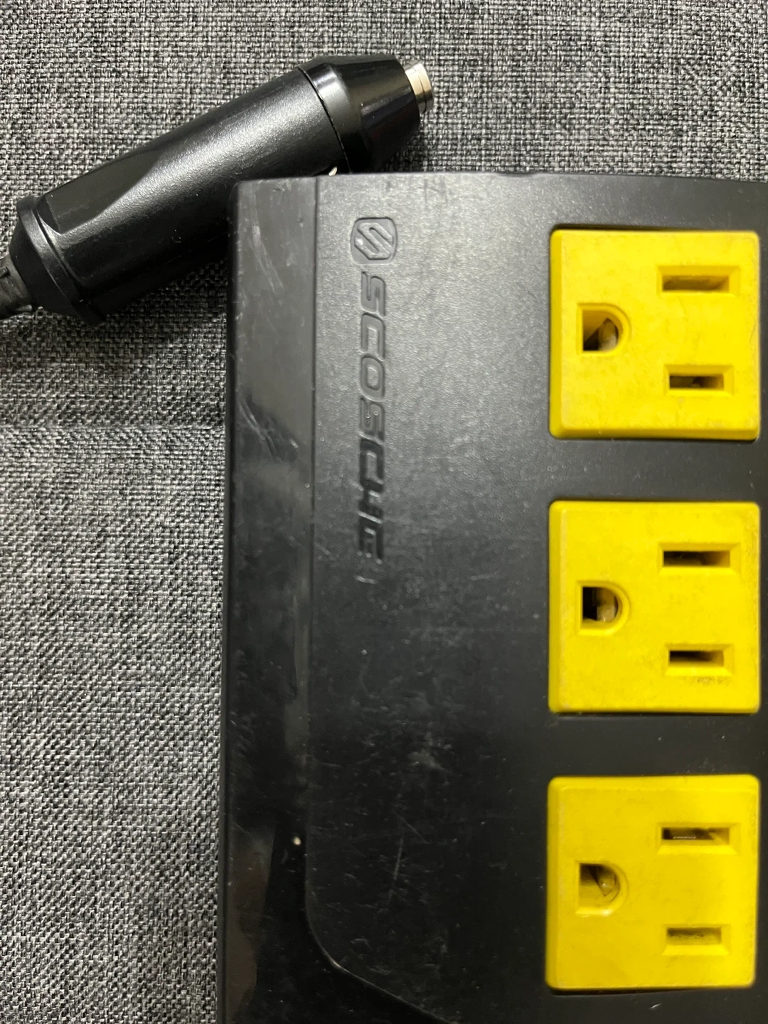 This Scosche power inverter converts 12-15VDC to 120VAC, 200W. It has three AC outlets and two USB outputs providing 5VDC at 2.4A total. It's great for powering electronics on the go!