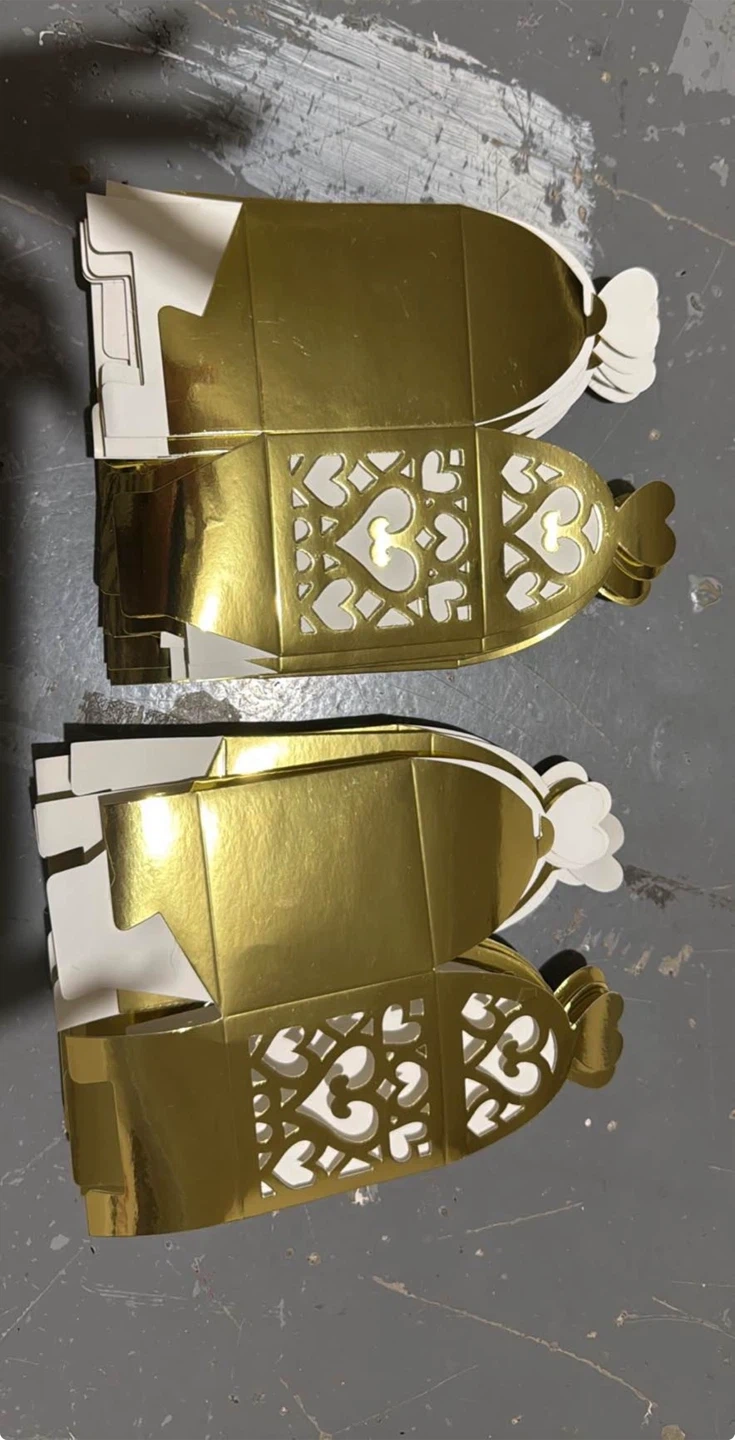 These decorative boxes are perfect for small gifts or treats! They're made of gold-coloured cardstock with intricate heart cut-outs. These boxes would be great for weddings or parties!