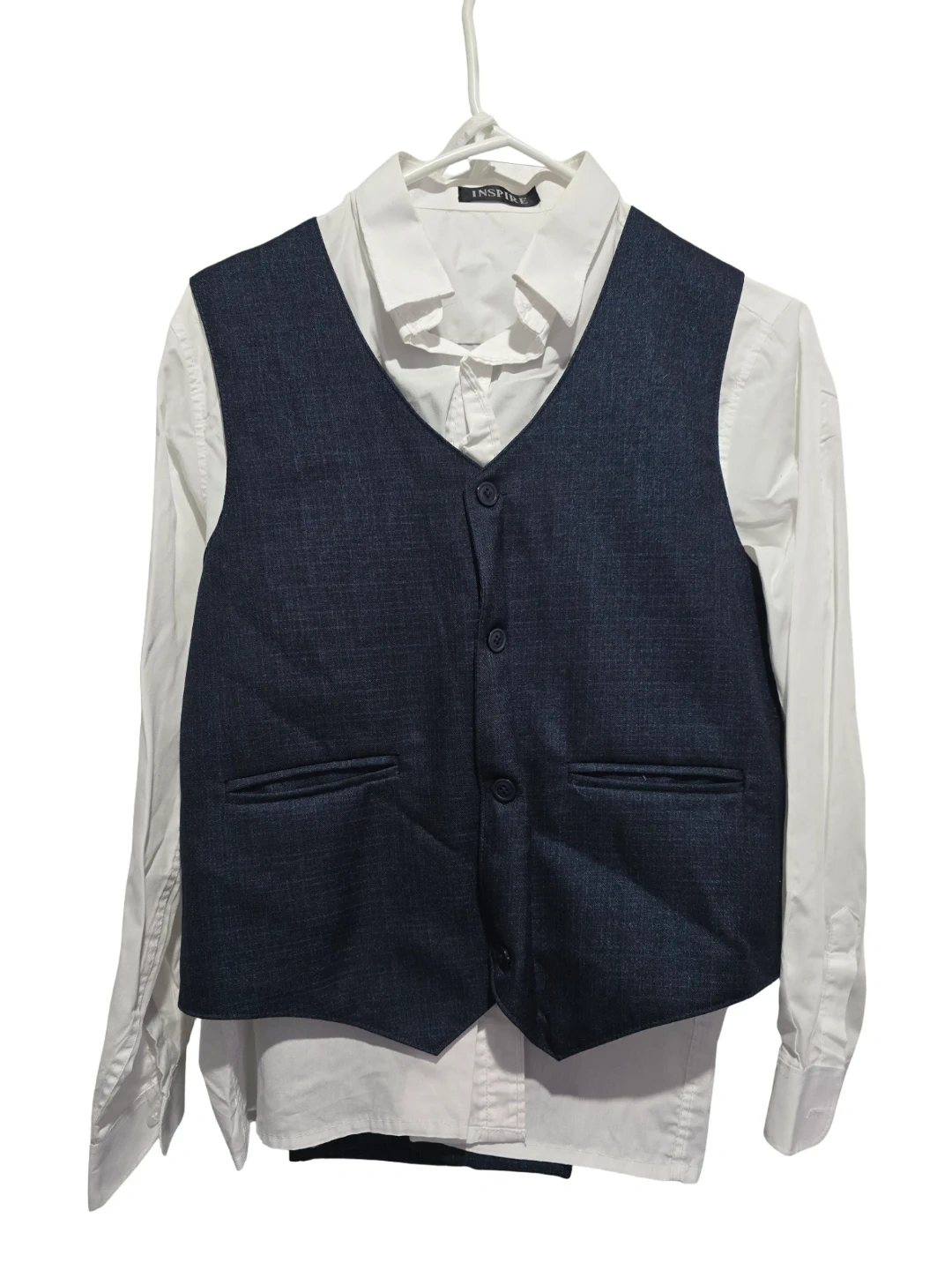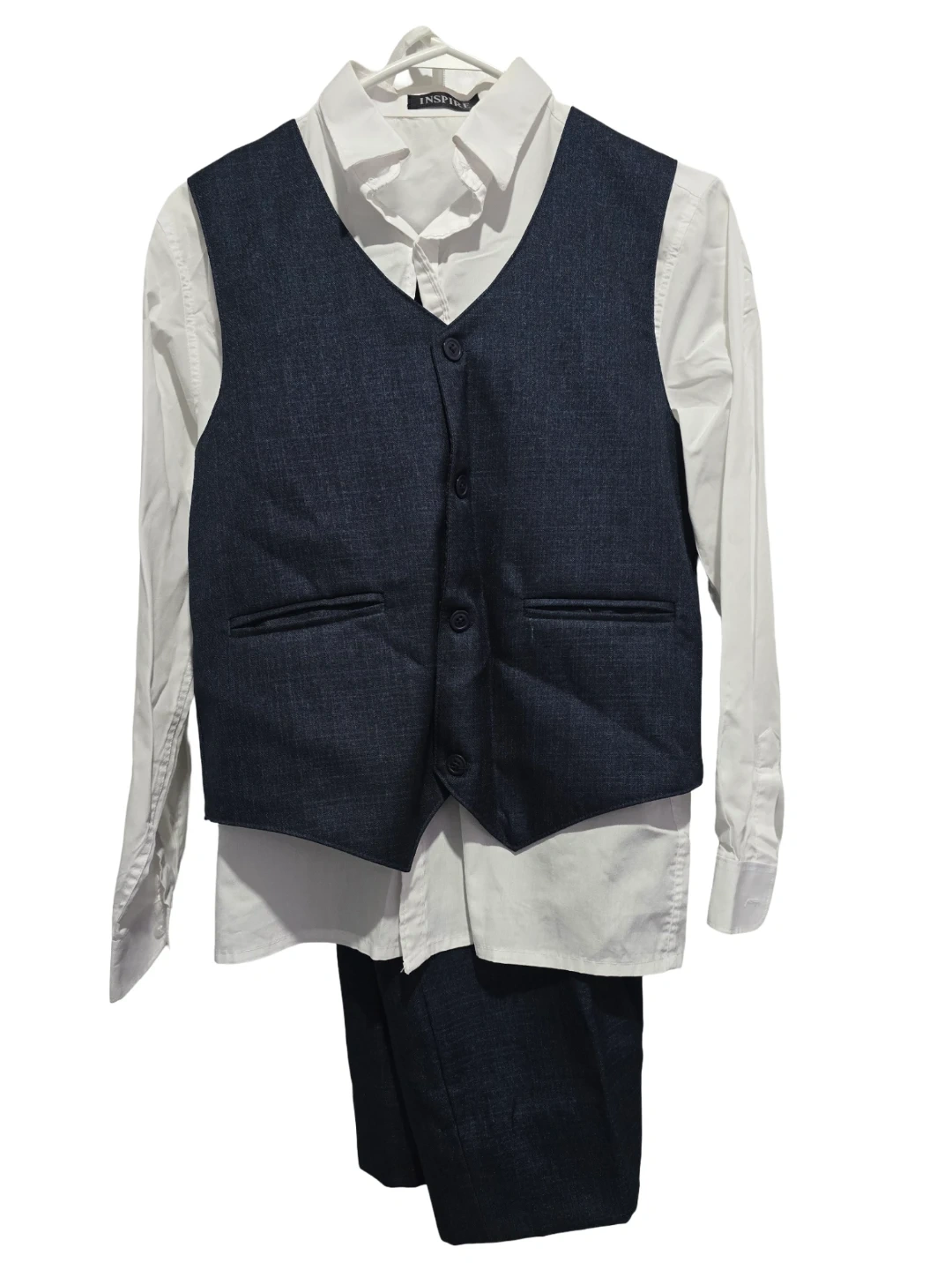 Here's a handsome Inspire boys' 5-piece suit, perfect for a special occasion! It includes a jacket, vest, pants, shirt, and tie. The suit is a stylish blue colour. A great outfit for your little guy!