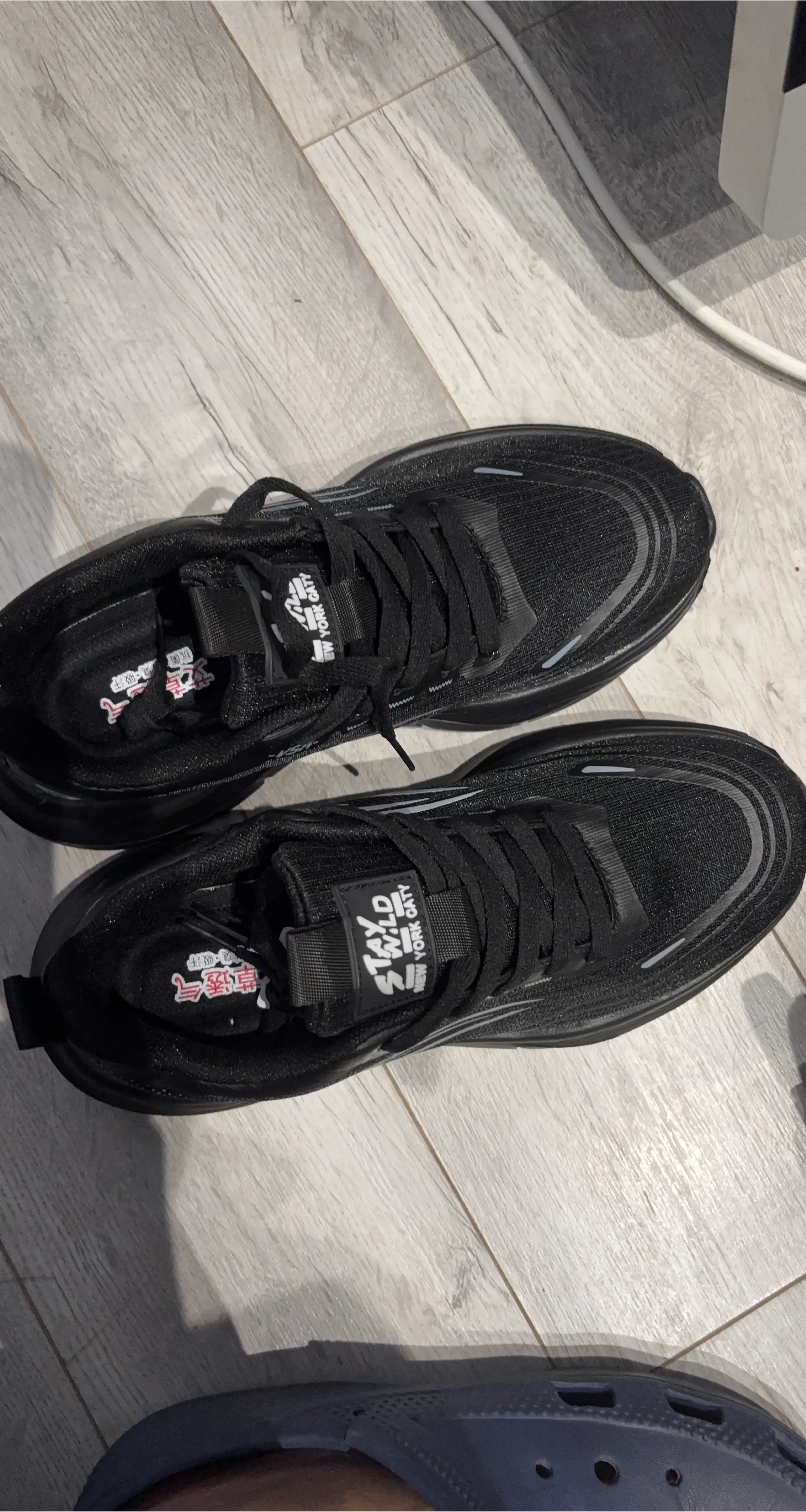 Black sneakers with "Stay Wild New York Caty" branding. These shoes feature breathable and sweat-wicking material. They're designed for comfort and active use.
