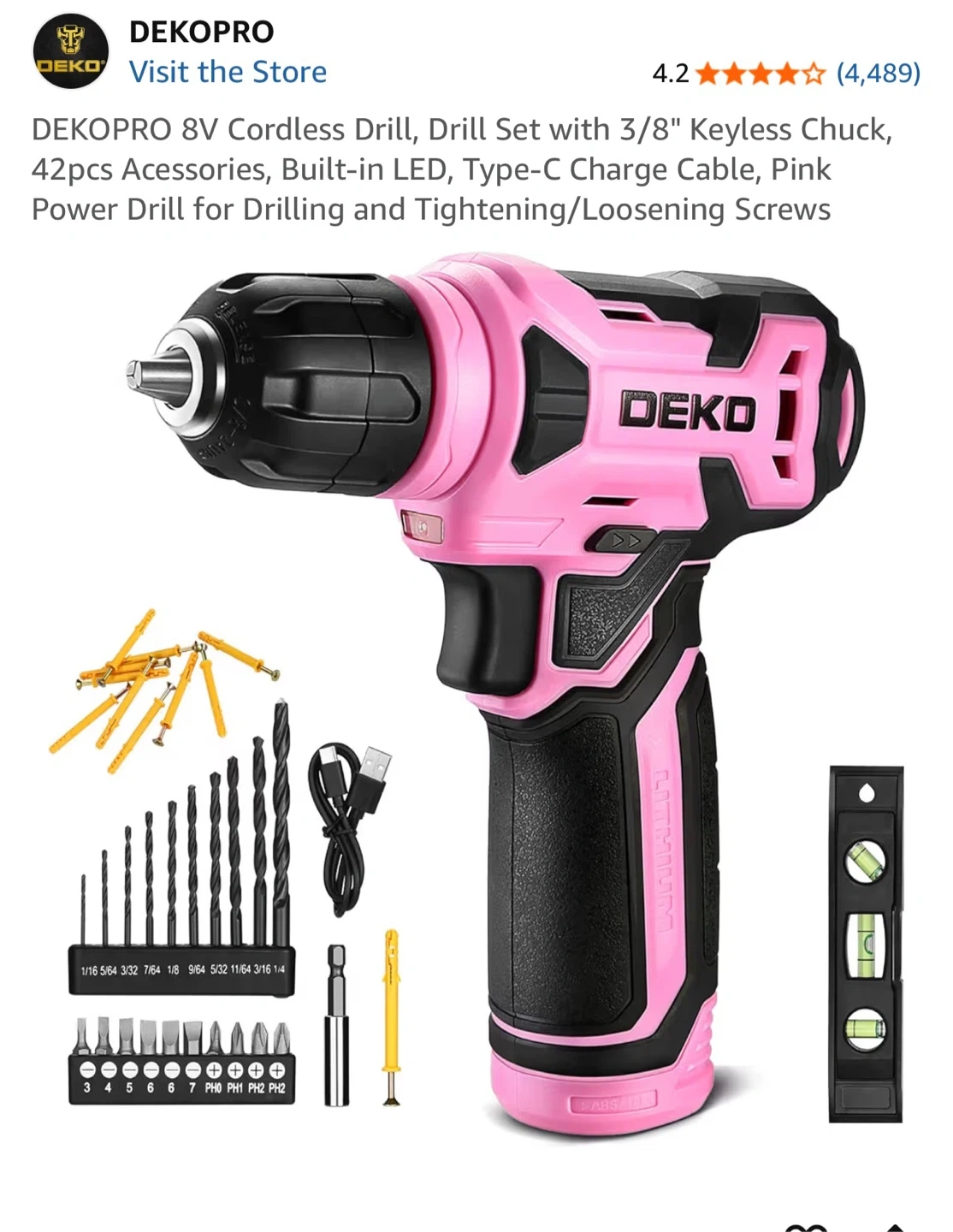 This is a DEKOPRO 8V pink cordless drill and drill set. It comes with 42 pieces of accessories, a built-in LED light, and a Type-C charge cable. The drill features a 3/8" keyless chuck for easy bit changes. This kit is great for drilling holes and tightening or loosening screws. Two batteries.