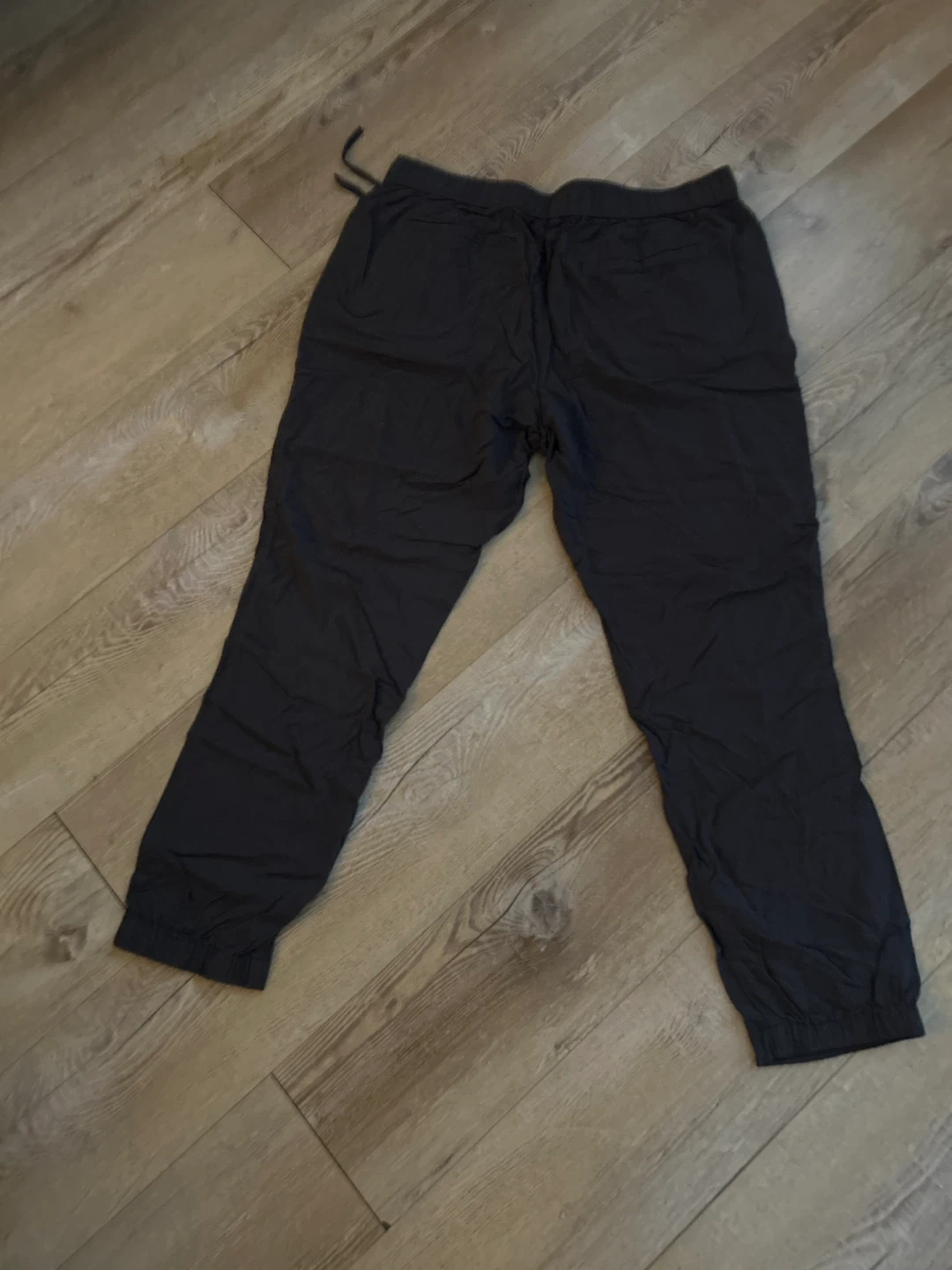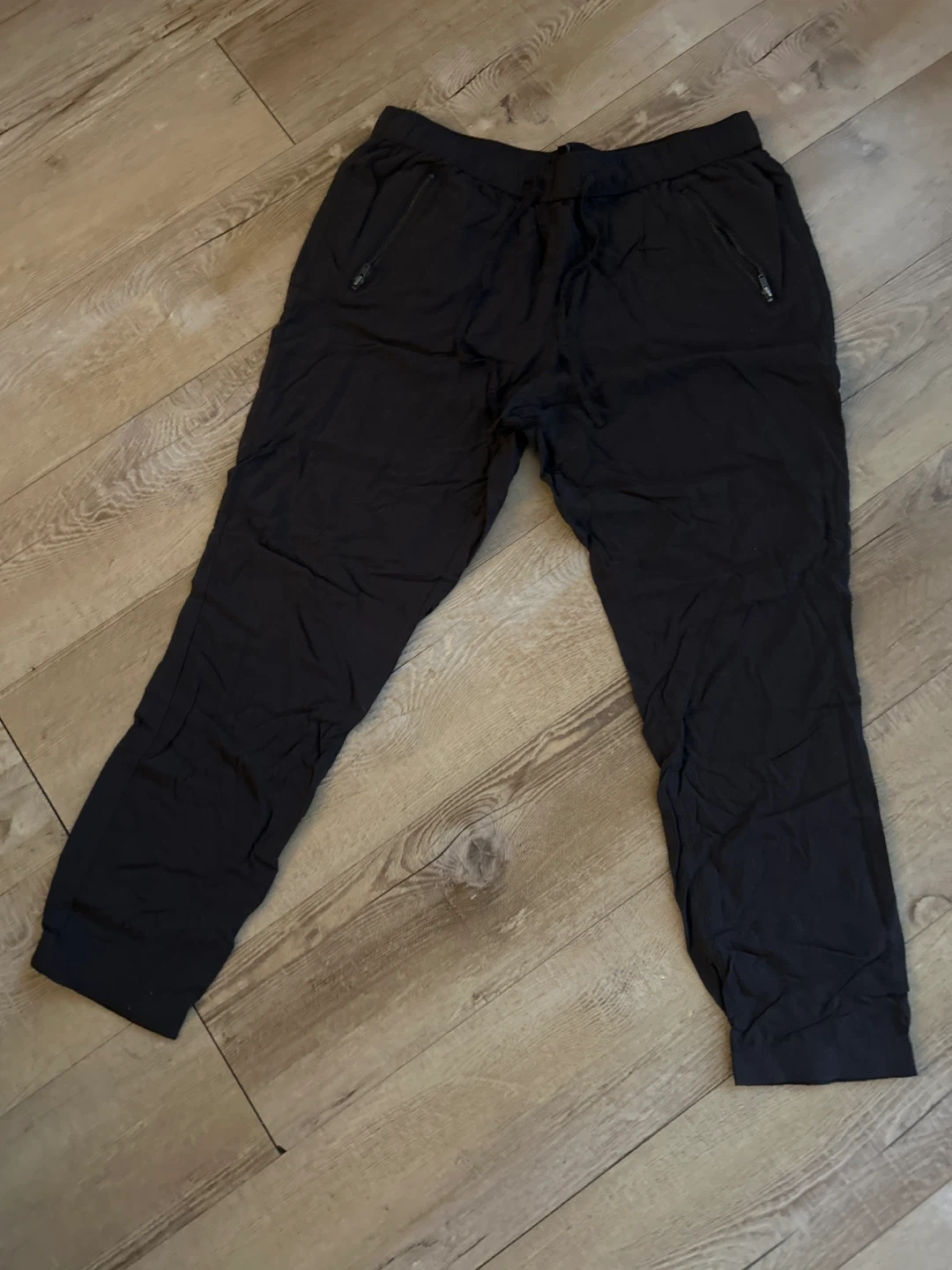 These are comfortable black jogger pants. They feature a drawstring waist and zippered pockets. These pants are a great choice for casual wear or light activity.