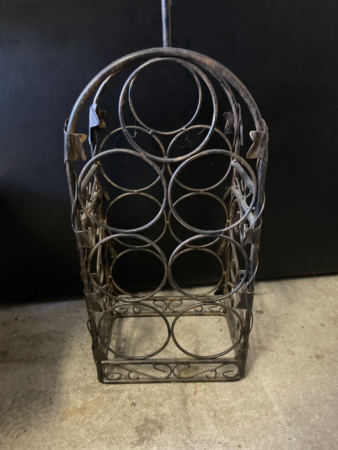 Here's a metal wine rack that can hold several bottles. It has a decorative design and would look great in a dining room or kitchen!
