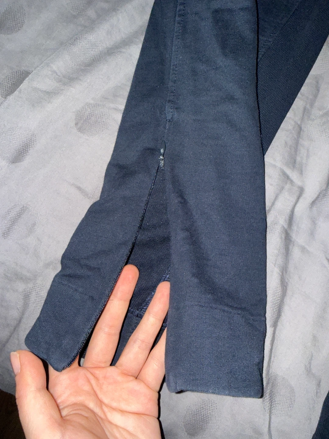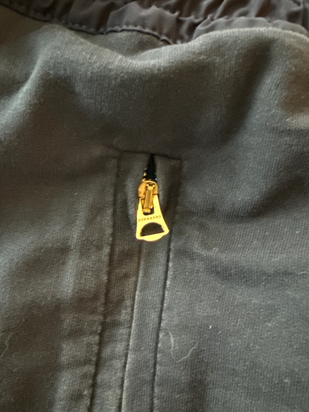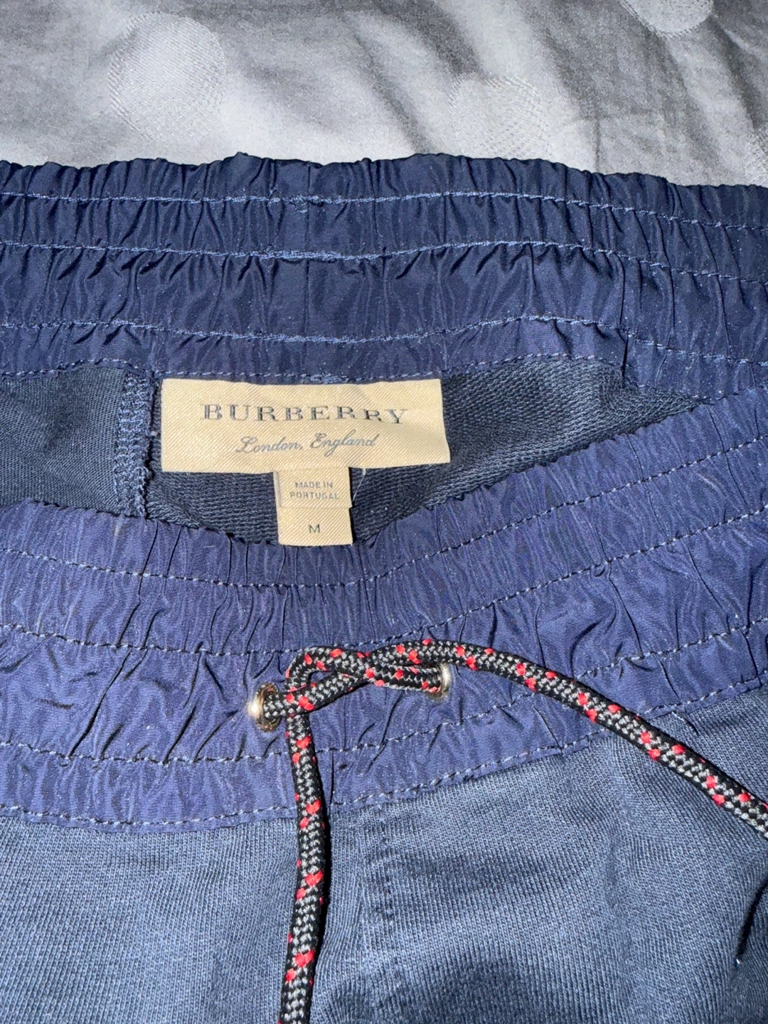 These are navy Burberry jogger pants in a size medium. They're made in Portugal and feature a drawstring waist and zippered pockets. The material appears to be a cotton blend.