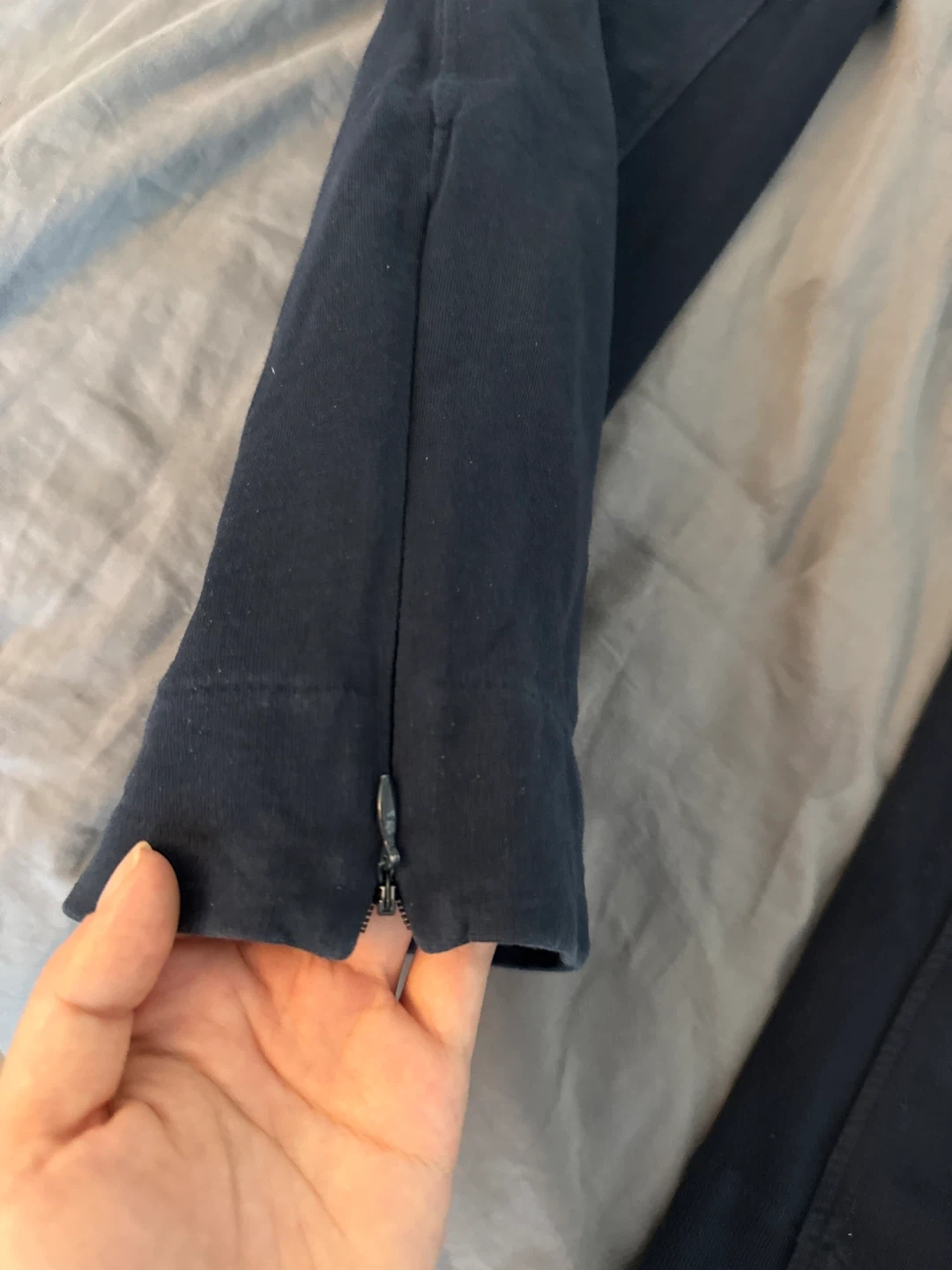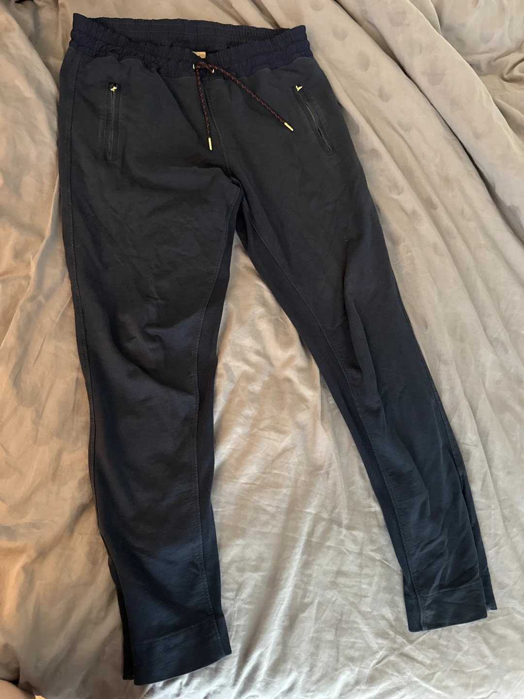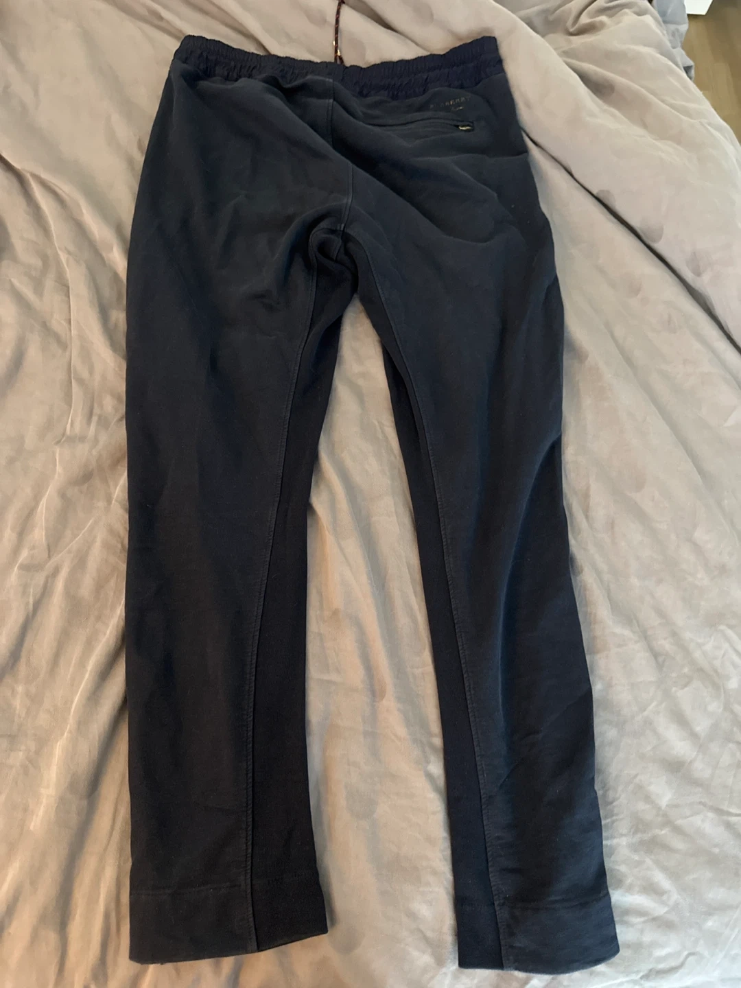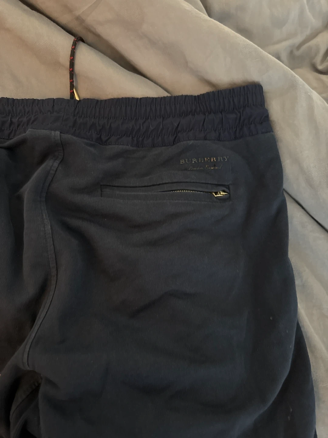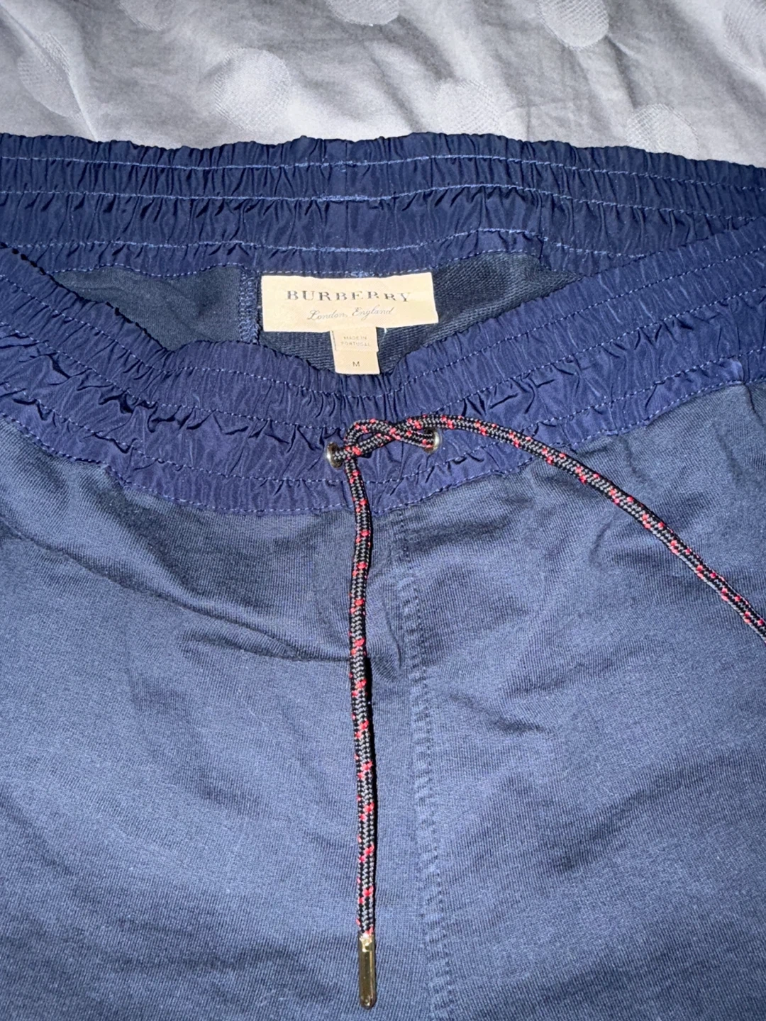 These are navy Burberry jogger pants in a size medium. They're made in Portugal and feature a drawstring waist and zippered pockets. The material appears to be a cotton blend.
