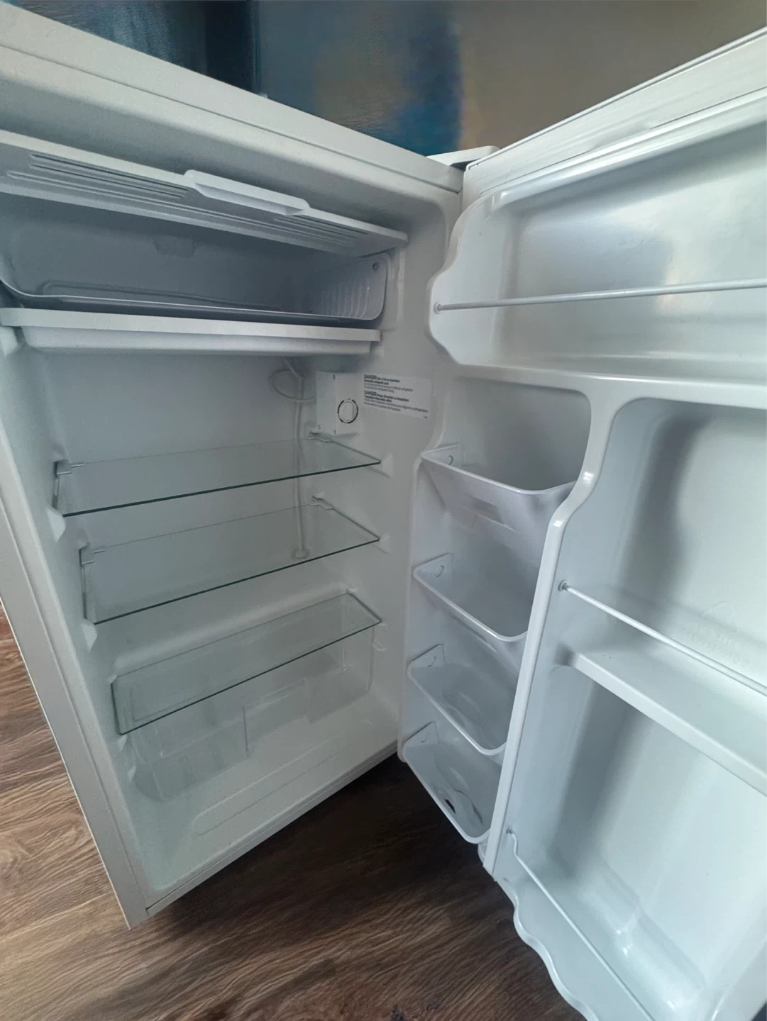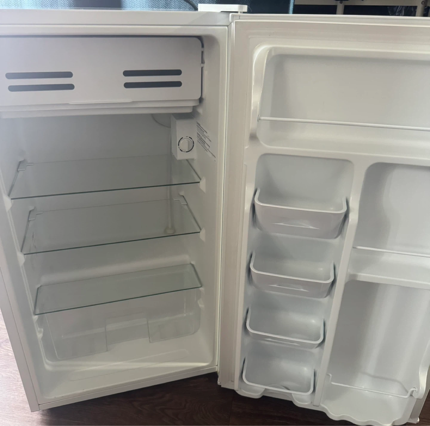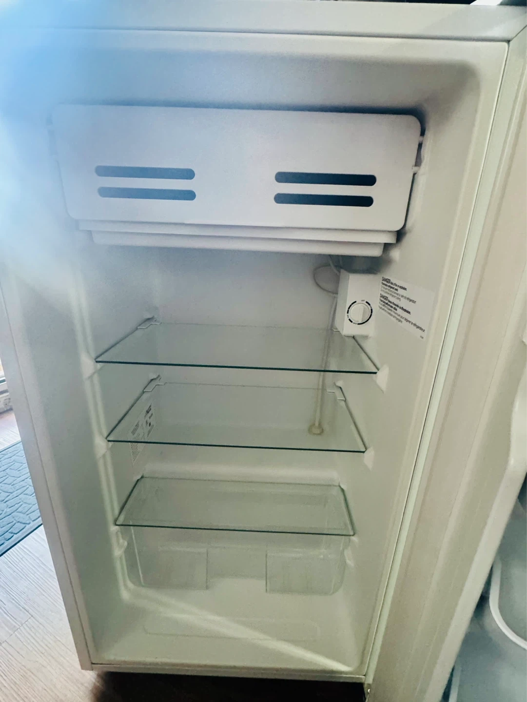 Arctic King mini fridge in white. Features adjustable glass shelves and door bins for storage. Great for dorm rooms or small spaces!