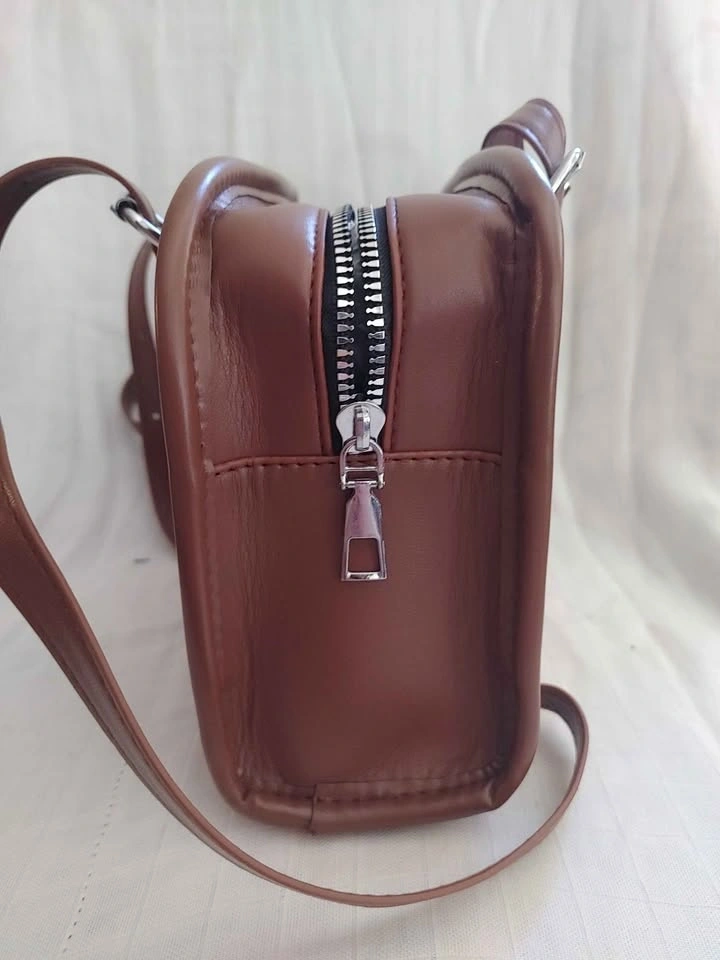 Brown shoulder bag made from faux leather.