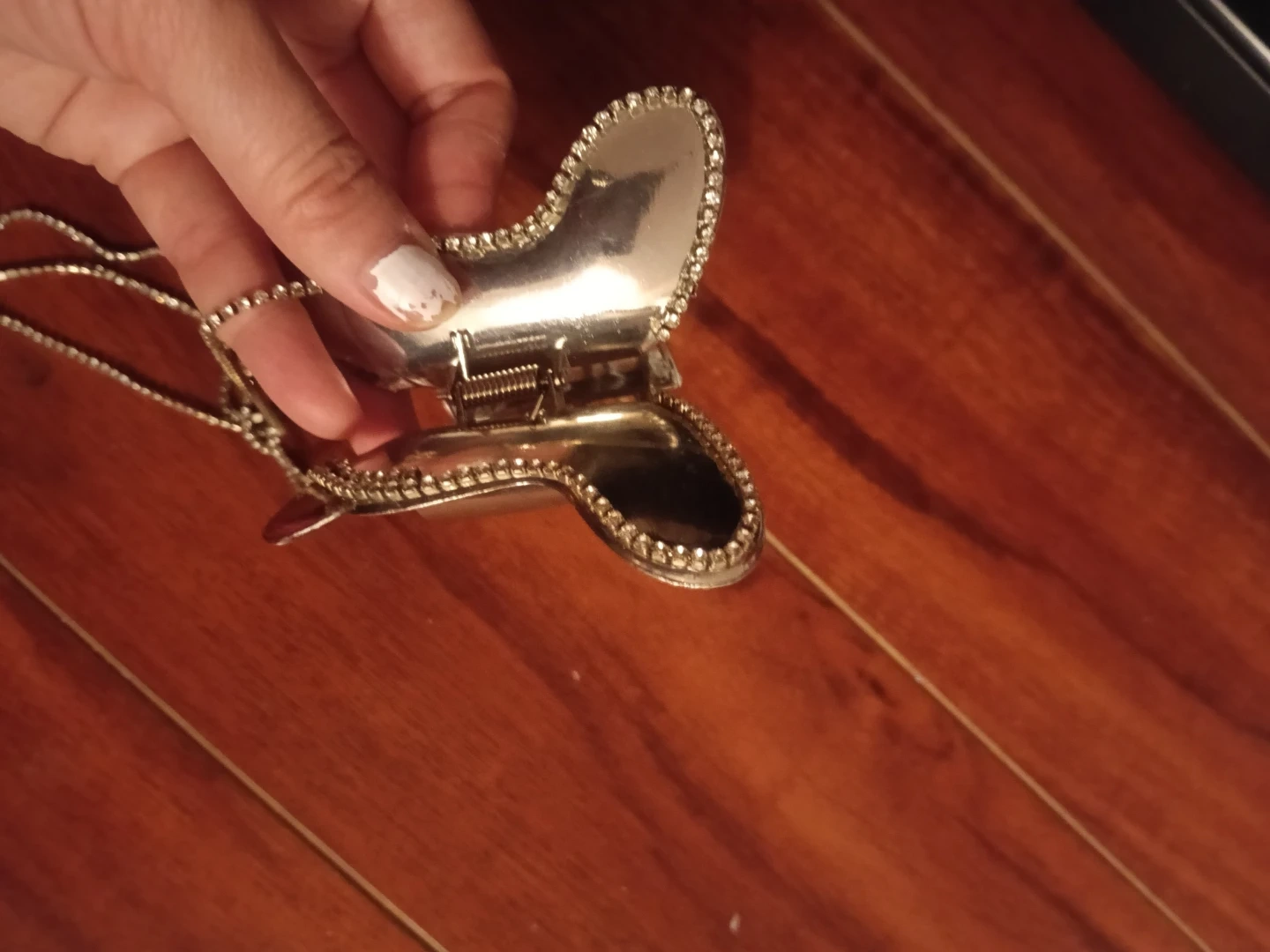 This silver tone clasp is shaped like a butterfly. It opens and closes with a spring mechanism and has a decorative chain attached. It's embellished with small rhinestones along the edges. The clasp could be used for crafts or as a decorative accent.