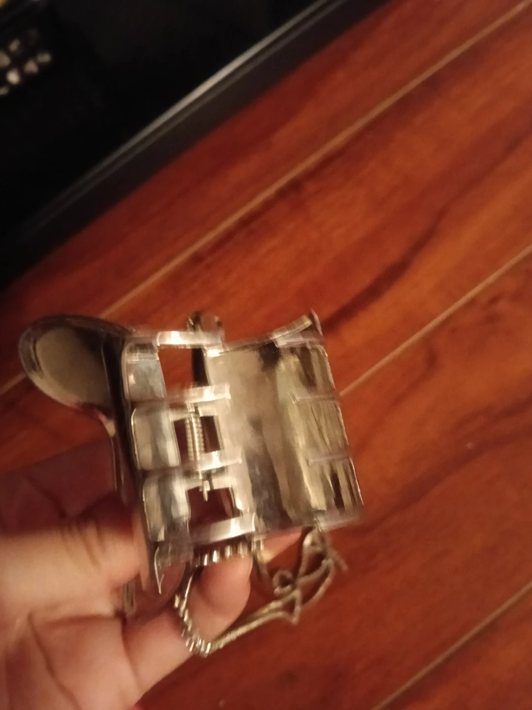 This silver tone clasp is shaped like a butterfly. It opens and closes with a spring mechanism and has a decorative chain attached. It's embellished with small rhinestones along the edges. The clasp could be used for crafts or as a decorative accent.