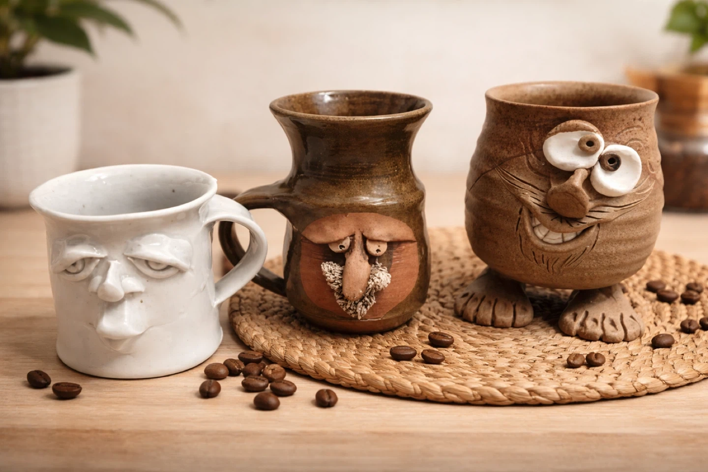 Selling a set of unique, handmade ceramic mugs with quirky face designs. These mugs are perfect for adding a touch of personality to your morning coffee or tea. They're in great condition and ready to bring some fun to your kitchen!