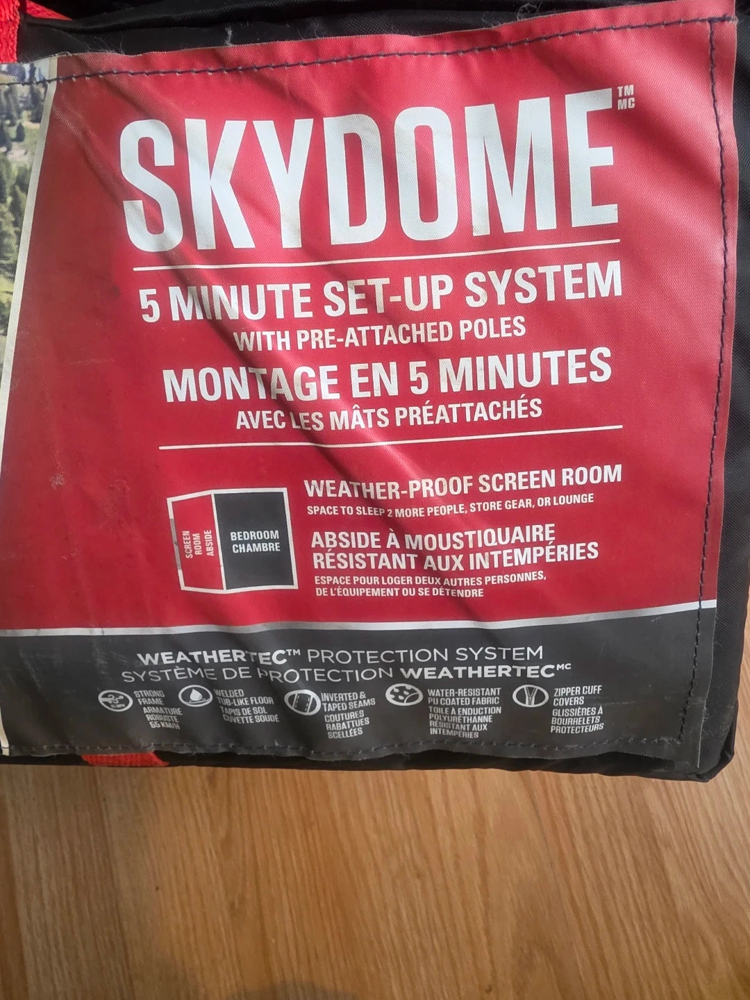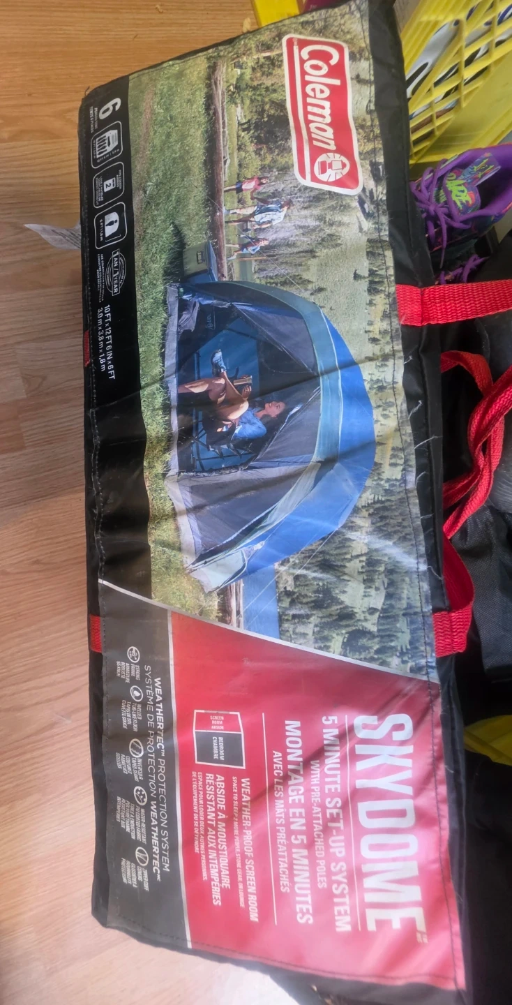 This is a Coleman Skydome 6 person tent with a 5-minute setup system. It features a Weather-Proof Screen Room that can sleep 2 more people or be used for gear storage. Dimensions are 12 ft x 10 ft.