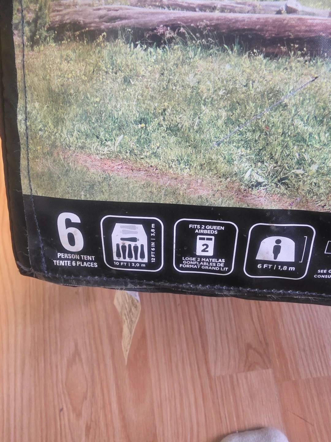 This is a Coleman Skydome 6 person tent with a 5-minute setup system. It features a Weather-Proof Screen Room that can sleep 2 more people or be used for gear storage. Dimensions are 12 ft x 10 ft.