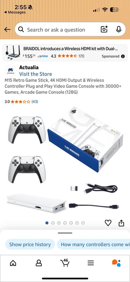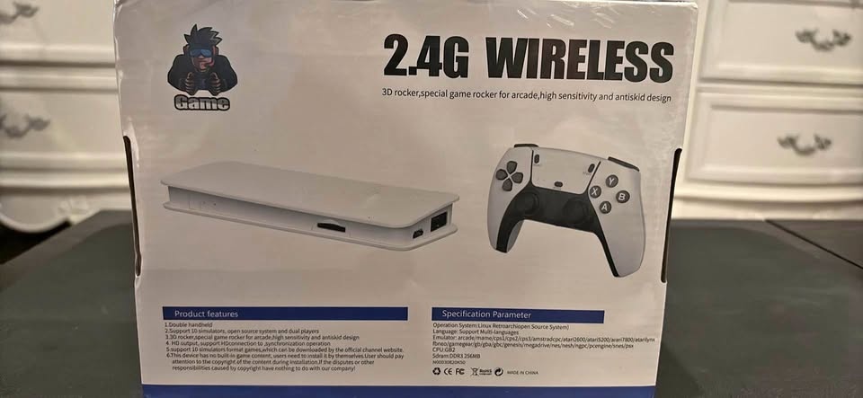 This is a brand new, sealed 2.4 wireless gaming system. It features an Aigame CPU, 256MB DDRIII memory, and a dual-core Cortex-A7 processor up to 1.0GHz. Connects via HDMI and supports 1080P/720P output. Supports multiple languages including English, Spanish, Portuguese, Korean, and Arabic. Package includes: Game Console, HDMI Cord, USB Charging Cable, 2 Wireless Gamepads, and Instruction Manual. Let me know if you're interested!