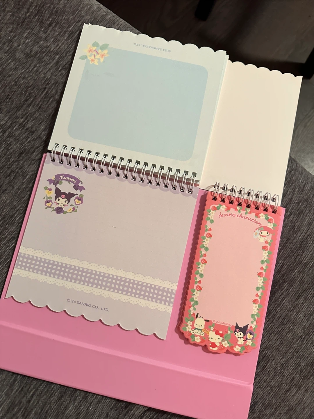 This cute pink spiral notebook features various Sanrio characters and comes with a sheet of matching stickers. It's perfect for jotting down notes or decorating your belongings. The set includes a small notepad and a larger spiral-bound notebook with decorative pages.