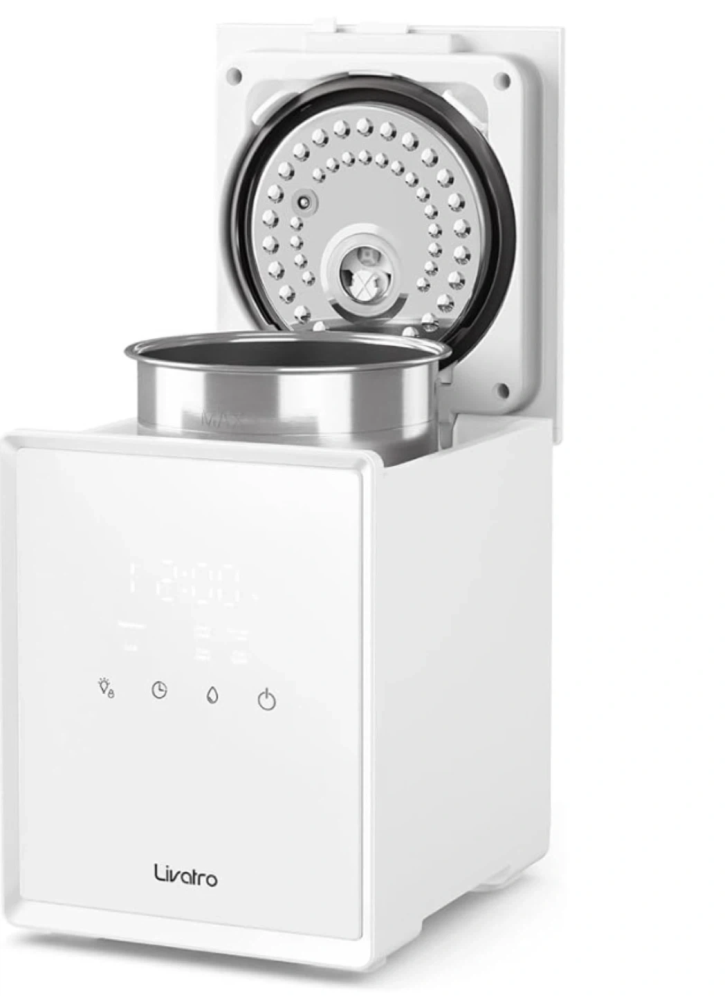 This is a white Livatron mini rice cooker. It's compact and features a digital display. Comes with a removable inner pot.