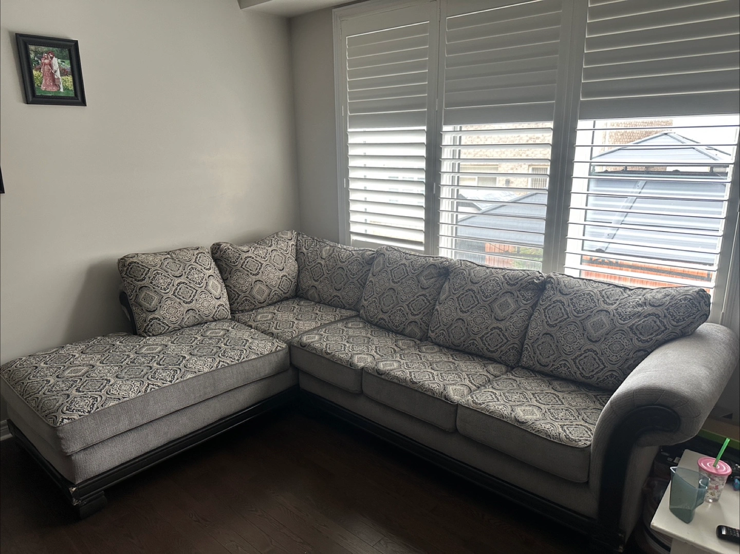 Large grey and black sectional sofa. Dark brown wooden legs. Elegant and cozy design. Pick up only please.