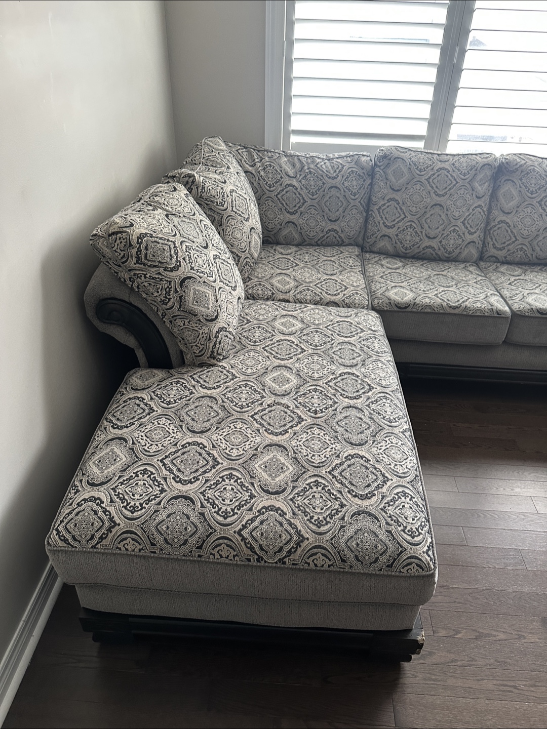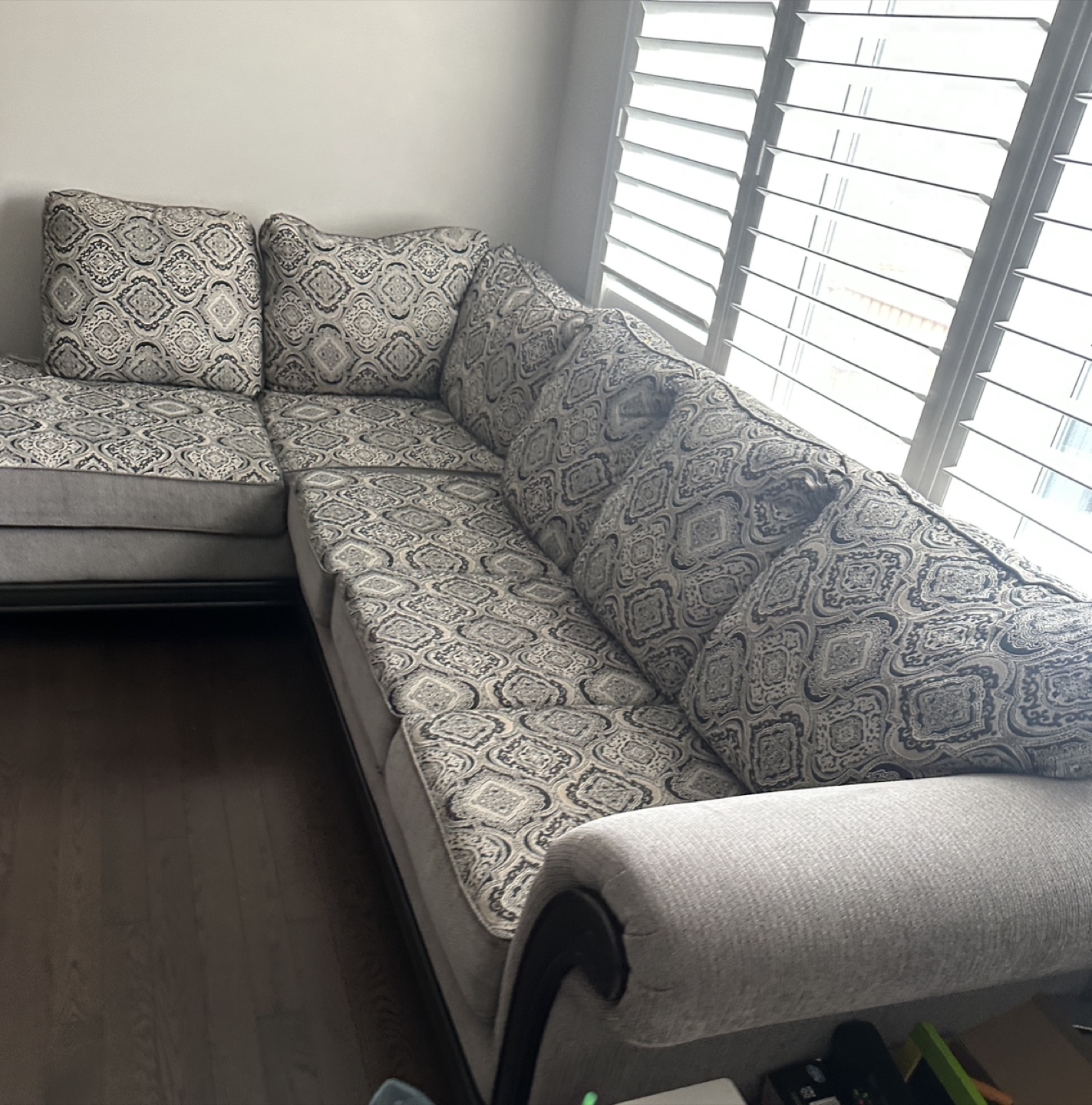 Large grey and black sectional sofa. Dark brown wooden legs. Elegant and cozy design. Pick up only please.