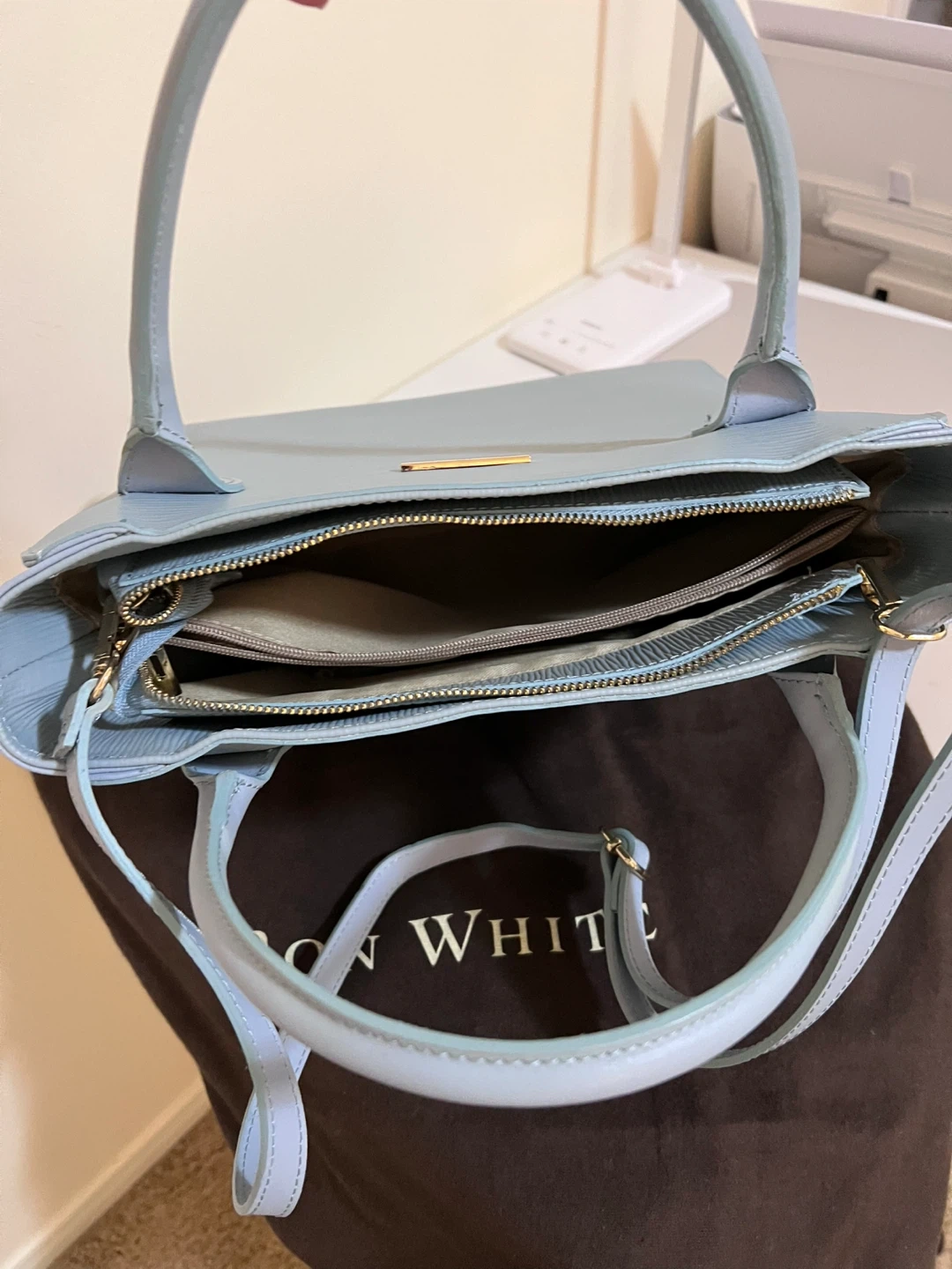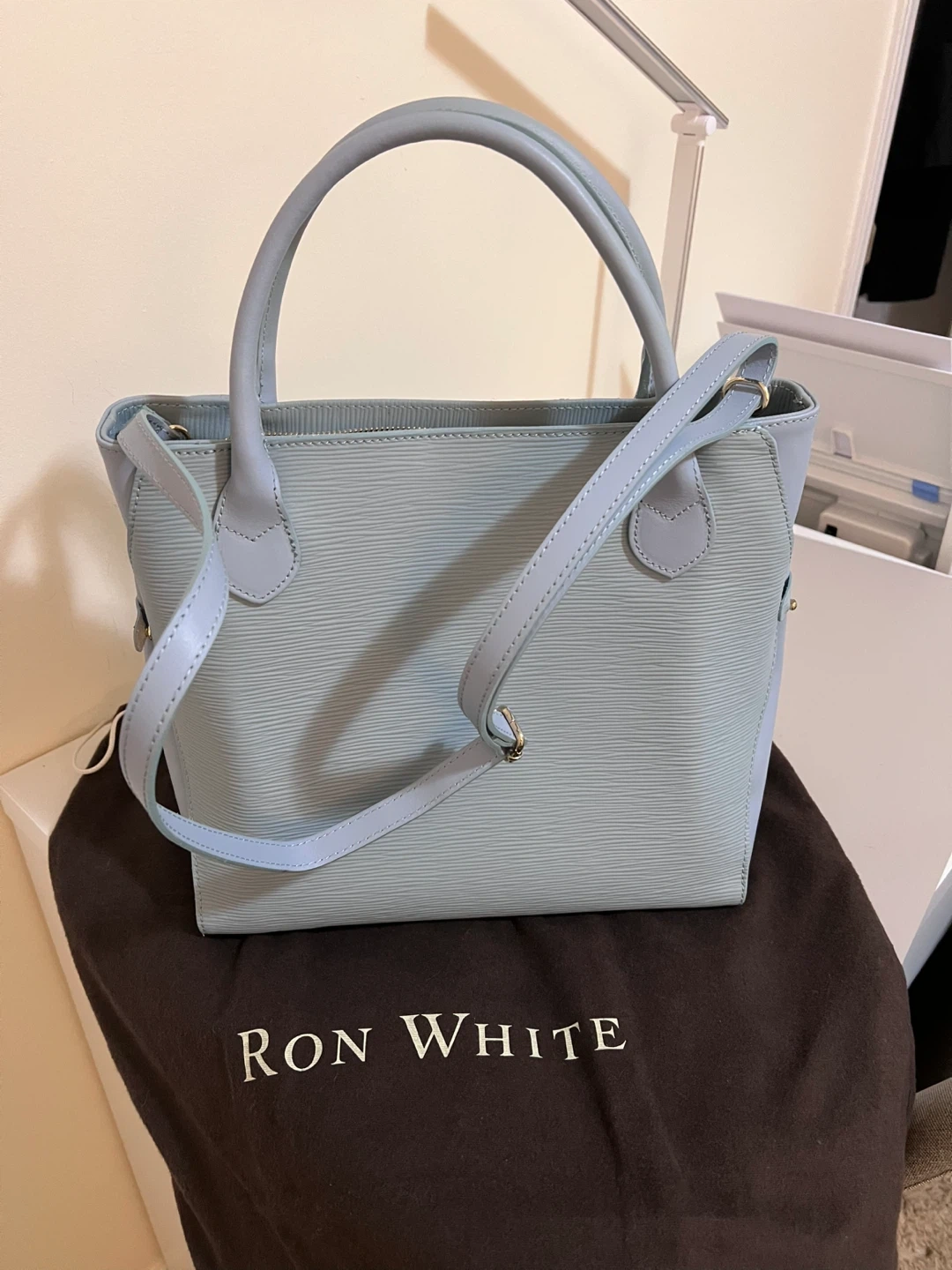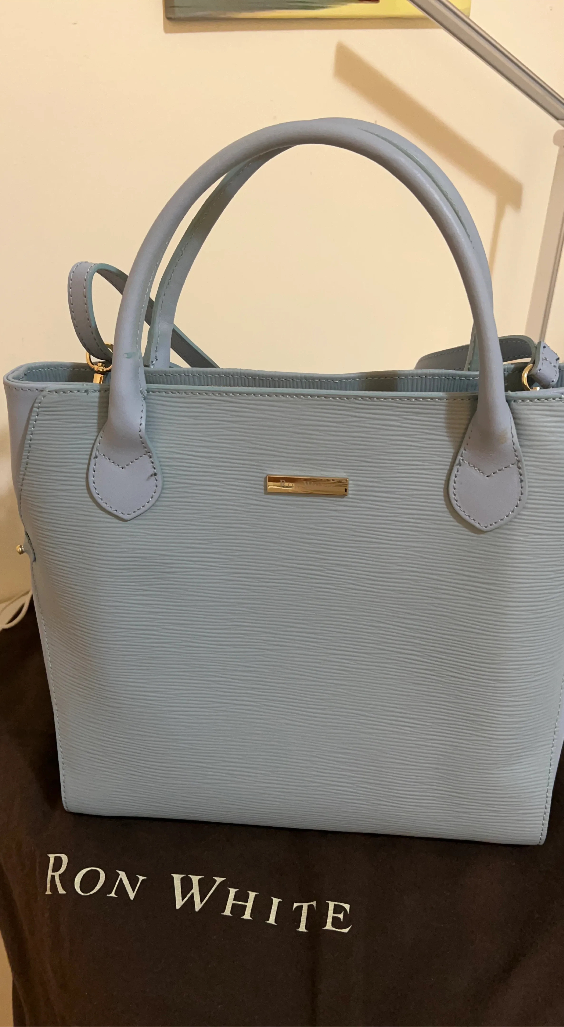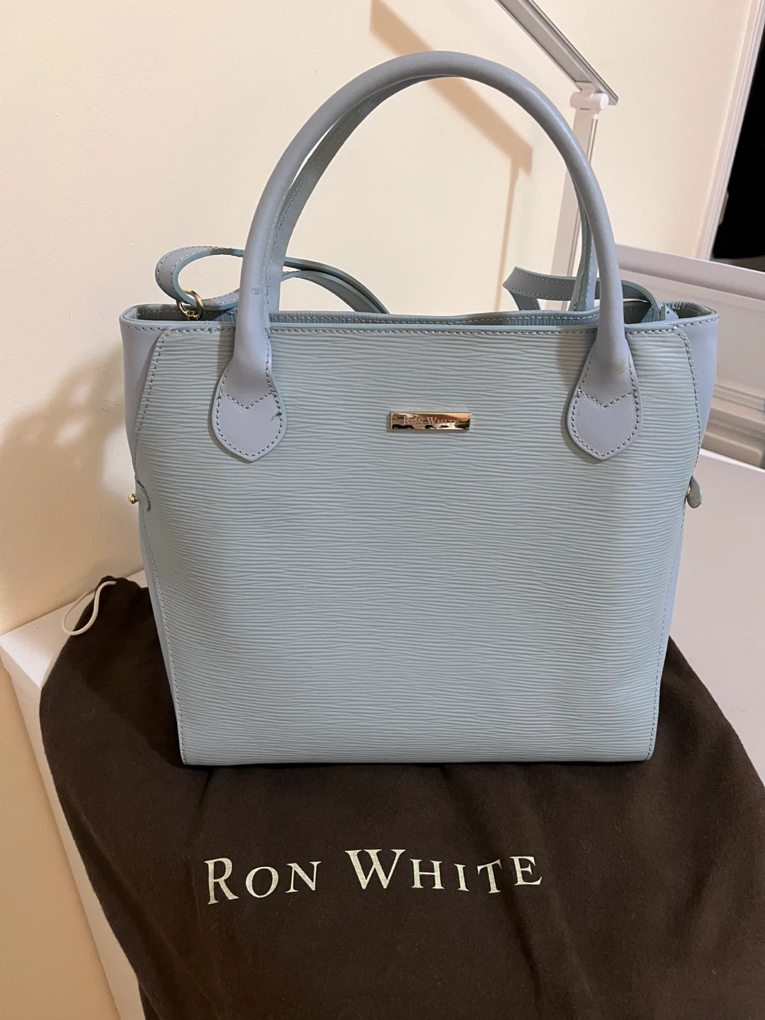 Light blue leather handbag by Ron White. It features a textured finish and a detachable shoulder strap. Includes dust bag.