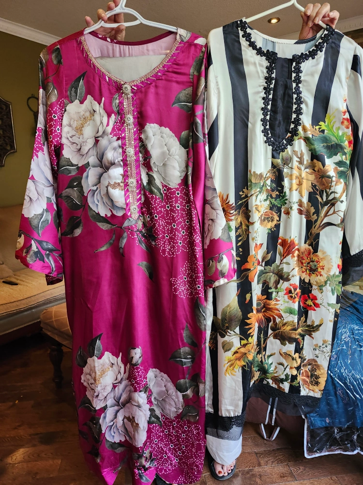 Two beautiful satin tunics, each with unique floral and stripe designs. One is a vibrant fuchsia, the other displays black and white stripes. Both have long sleeves. They could be a wonderful choice for a summer evening.
