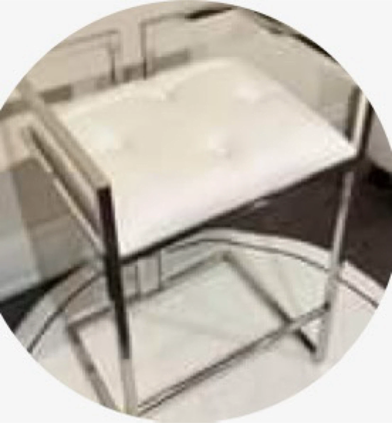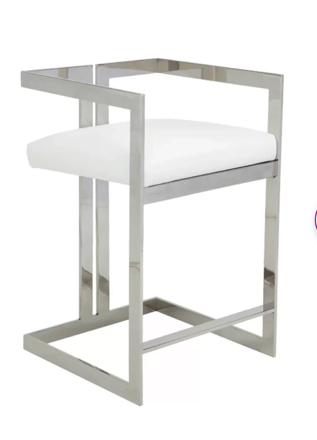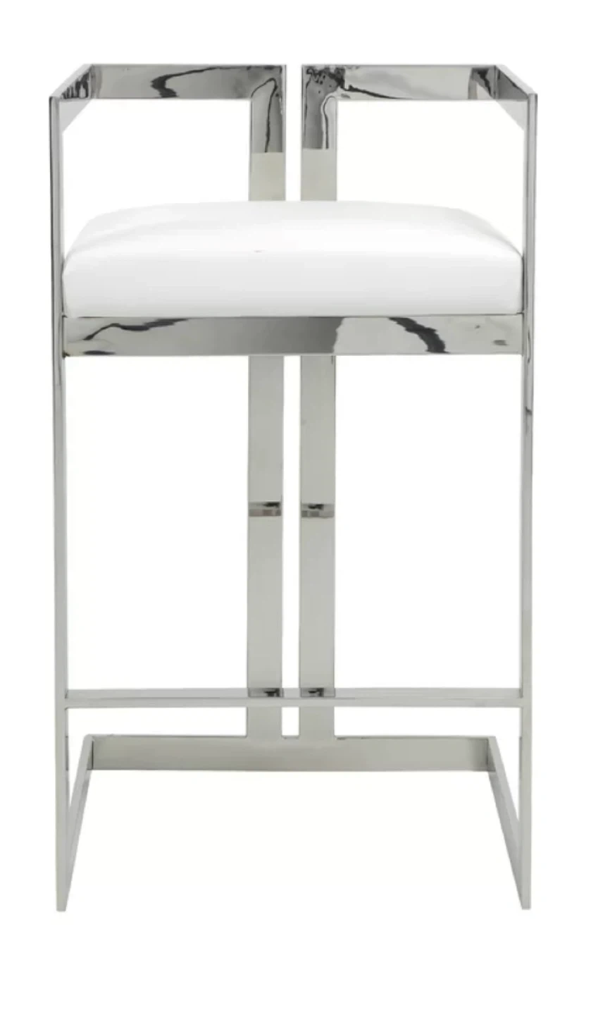 This bar stool features a sleek chrome frame and a comfortable white cushioned seat. Its modern design is sure to complement any kitchen island or home bar. Frame is metal; seat is upholstered.