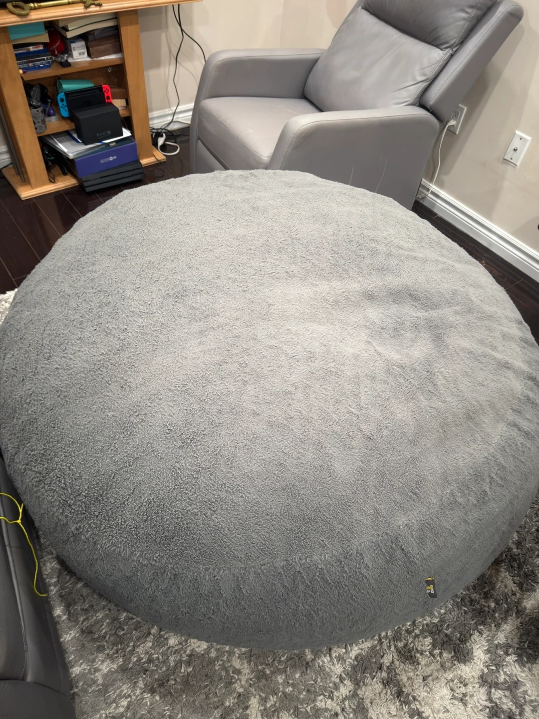 Comfortable, large bean bag chair in a soft grey fabric. Its round shape and plush texture make it a cozy spot for lounging. This chair is perfect for a family room or casual living space.