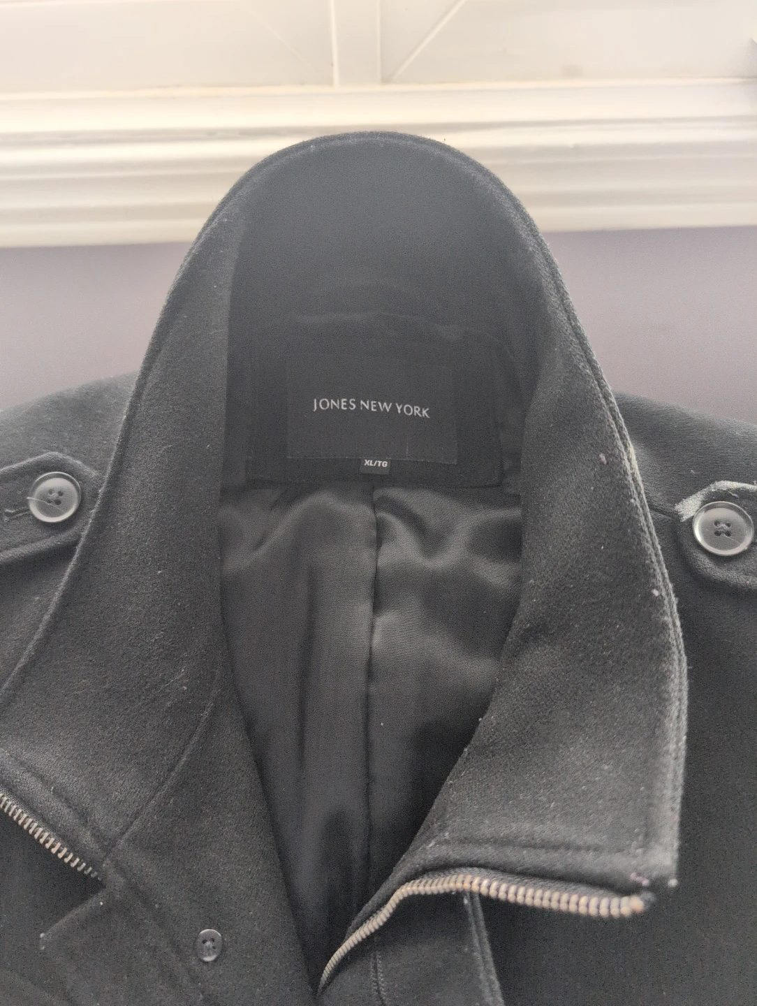 Black wool blend jacket from Jones New York. It's a military-style design with a zip-up front and button closure pockets. Size is XL.