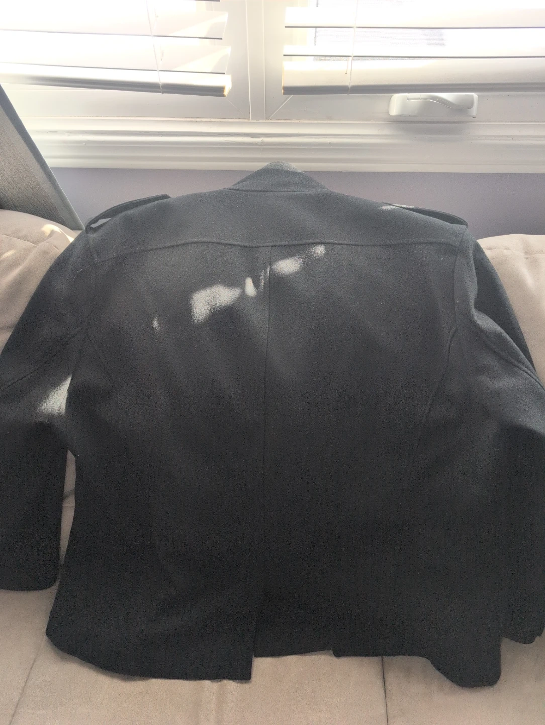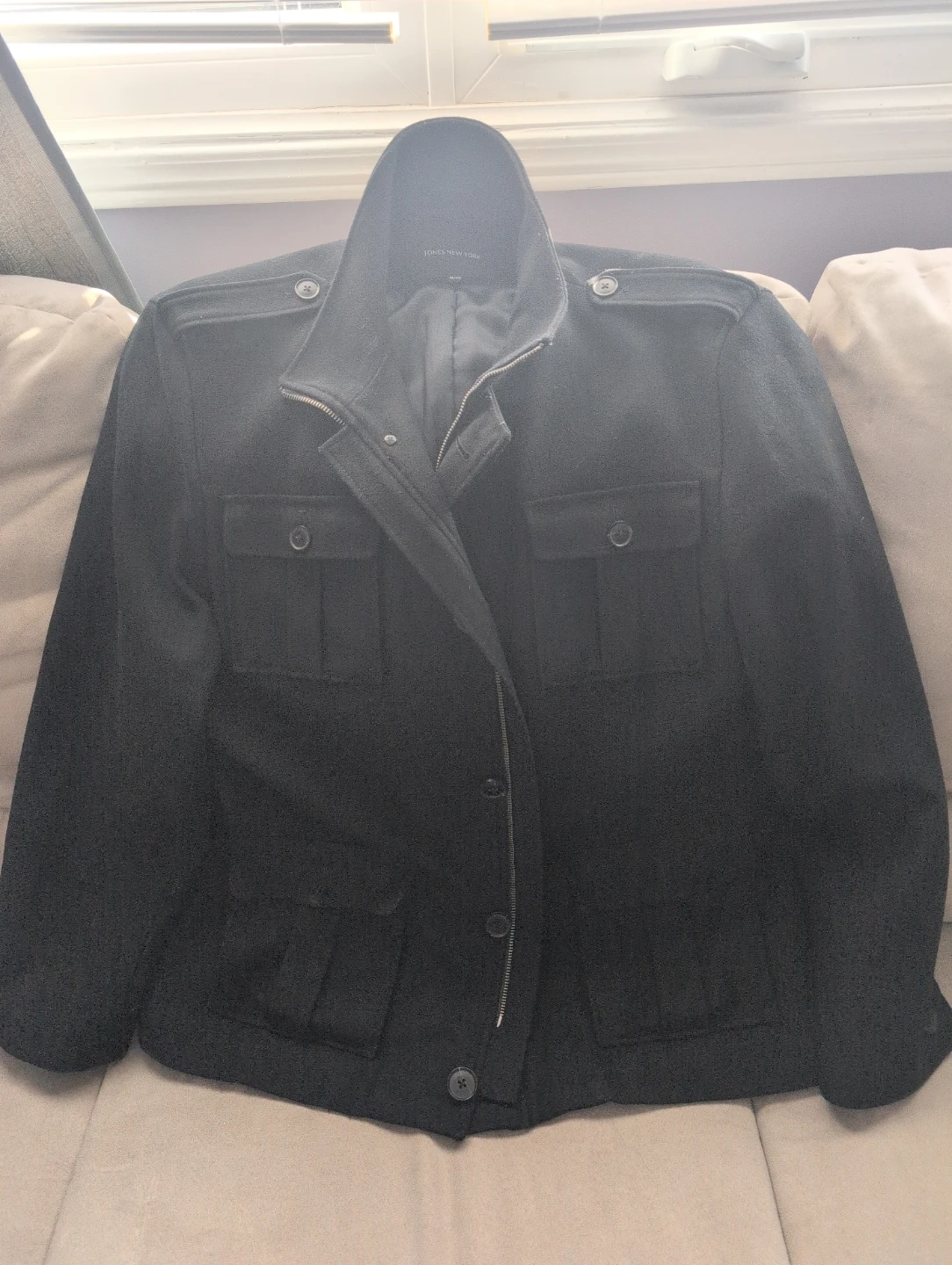Black wool blend jacket from Jones New York. It's a military-style design with a zip-up front and button closure pockets. Size is XL.