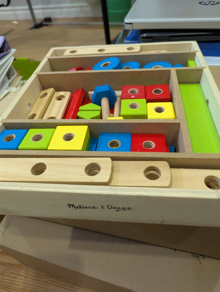 This is a Melissa & Doug wooden building set with lots of colourful pieces! It's a great toy for creative play and helps with fine motor skills. All pieces are in excellent condition and ready for a new home