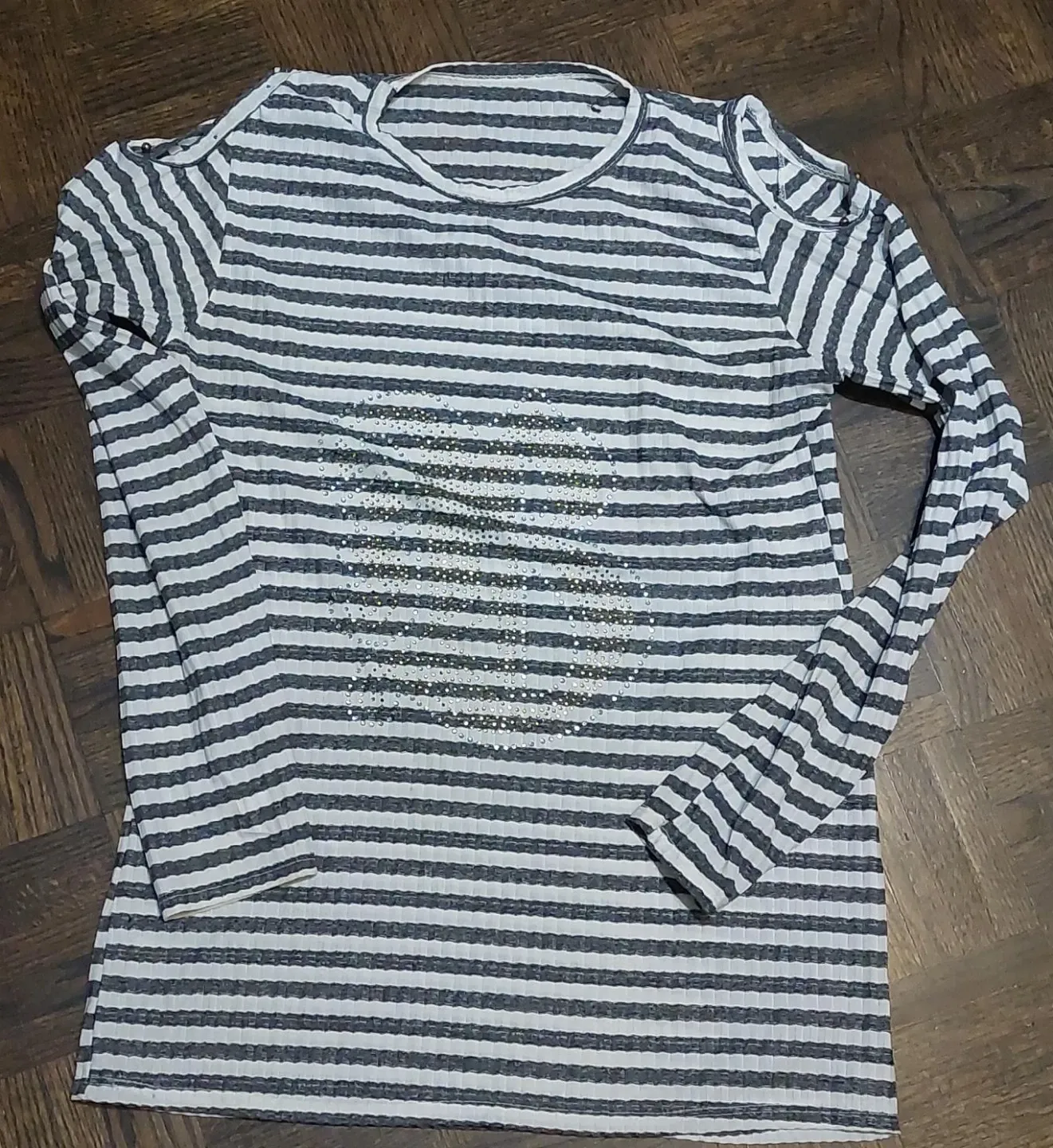 Cute girls' long sleeve top featuring grey and white stripes. It has a sparkly heart design on the front. The material's ribbed for a comfy fit.