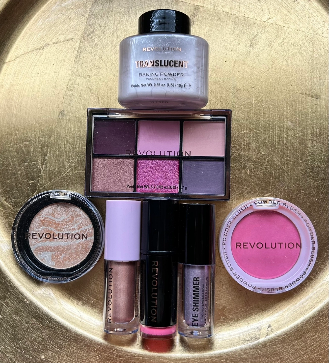 Makeup Revolution bundle. Includes eyeshadow palette, translucent baking powder, powder blush and highlighter and more. Shades vary. Perfect for creating a variety of looks. $15 for all 😊