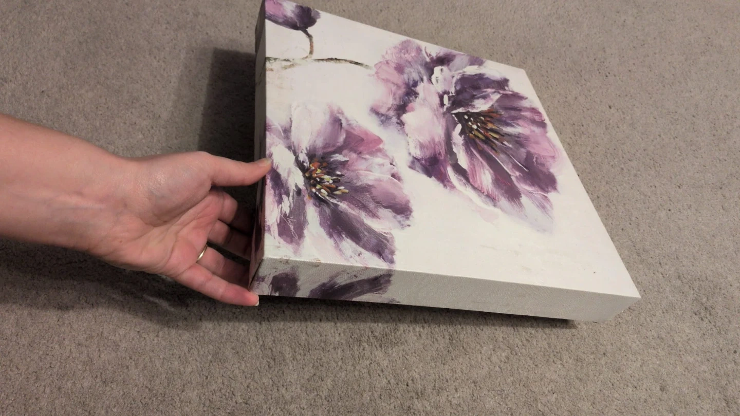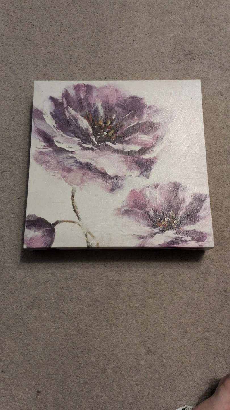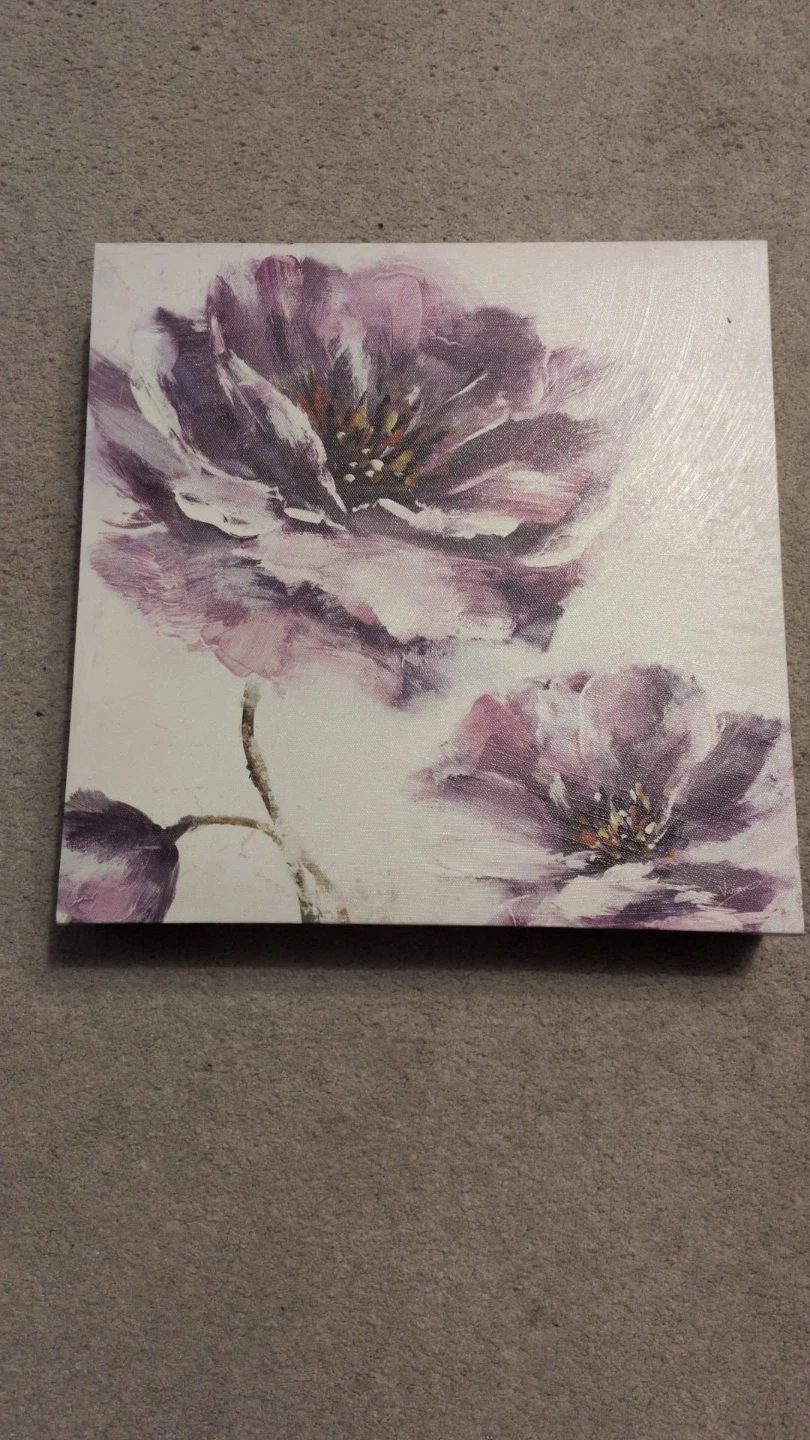 A pretty floral canvas print! It's in great shape and ready to brighten up any room. The colours are soft and calming, with a lovely design in purple flowers.