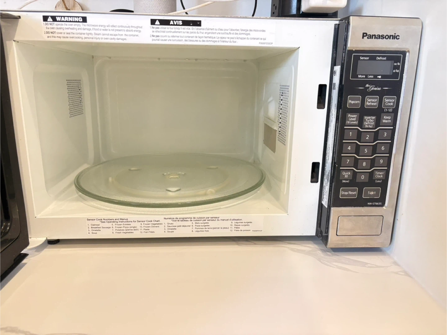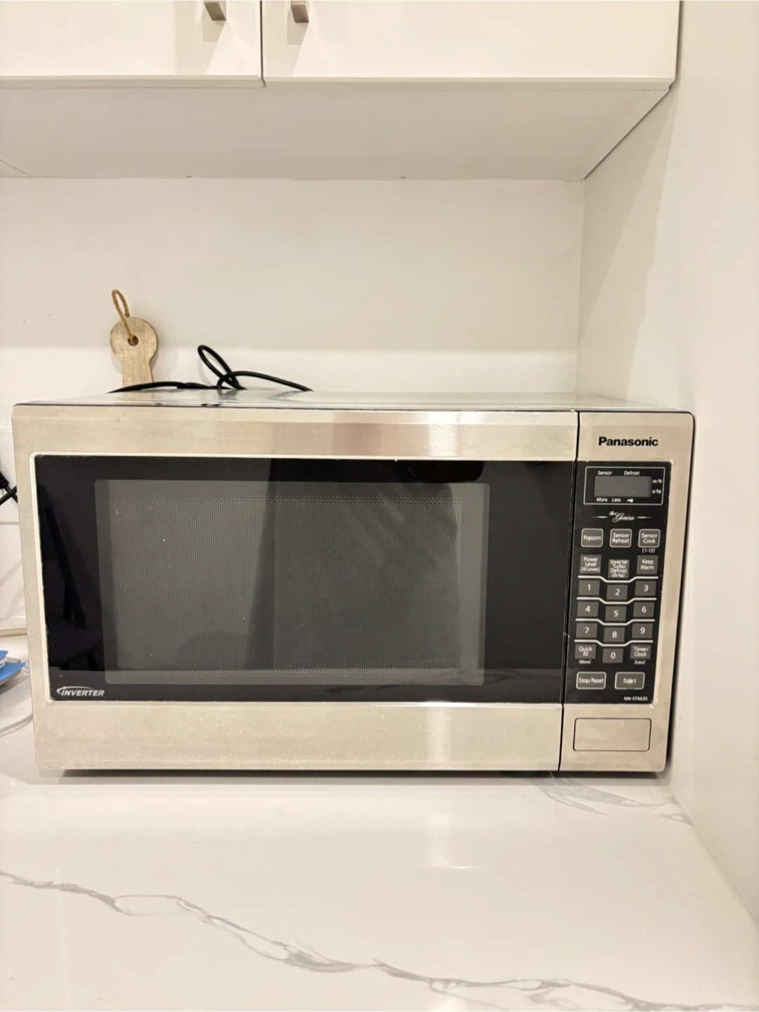 This is a Panasonic microwave oven with inverter technology. It features a sensor cook and sensor reheat function. The interior has a glass turntable for even heating.