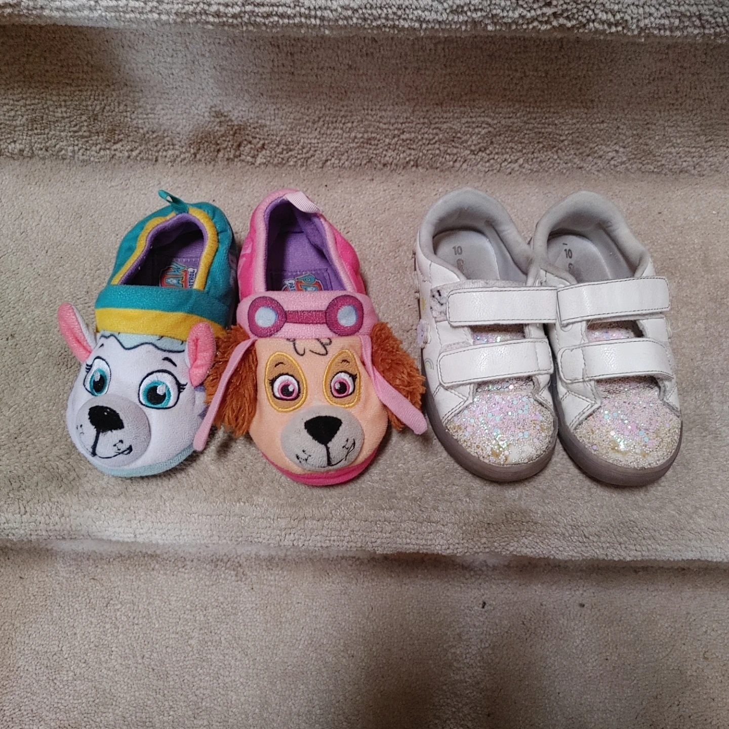 Two pairs of kids' shoes. Includes Paw Patrol character slippers and white glitter sneakers with velcro straps. Sneakers are a size 10. 5 dollar each