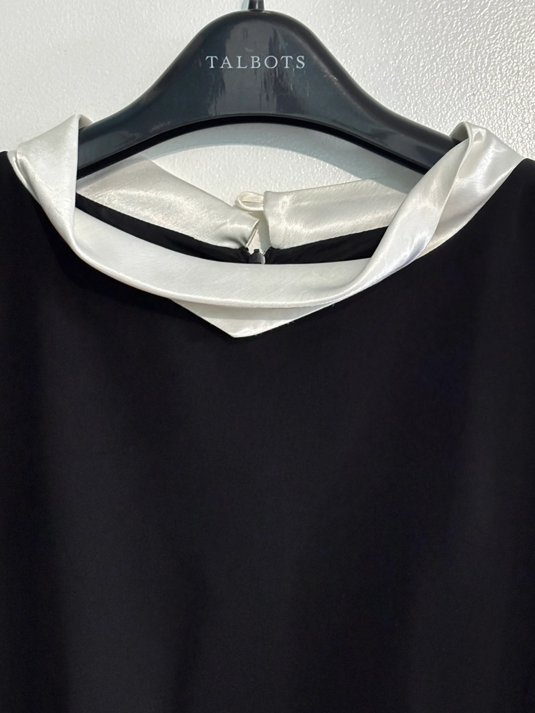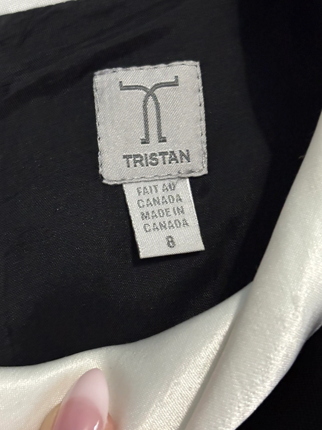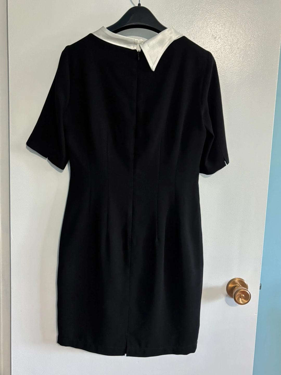 Only worn once for an event. Gorgeous black dress with a white silk collar. There’s no stretch to the dress, so make sure you’re a size 8. Comes with garment bag.