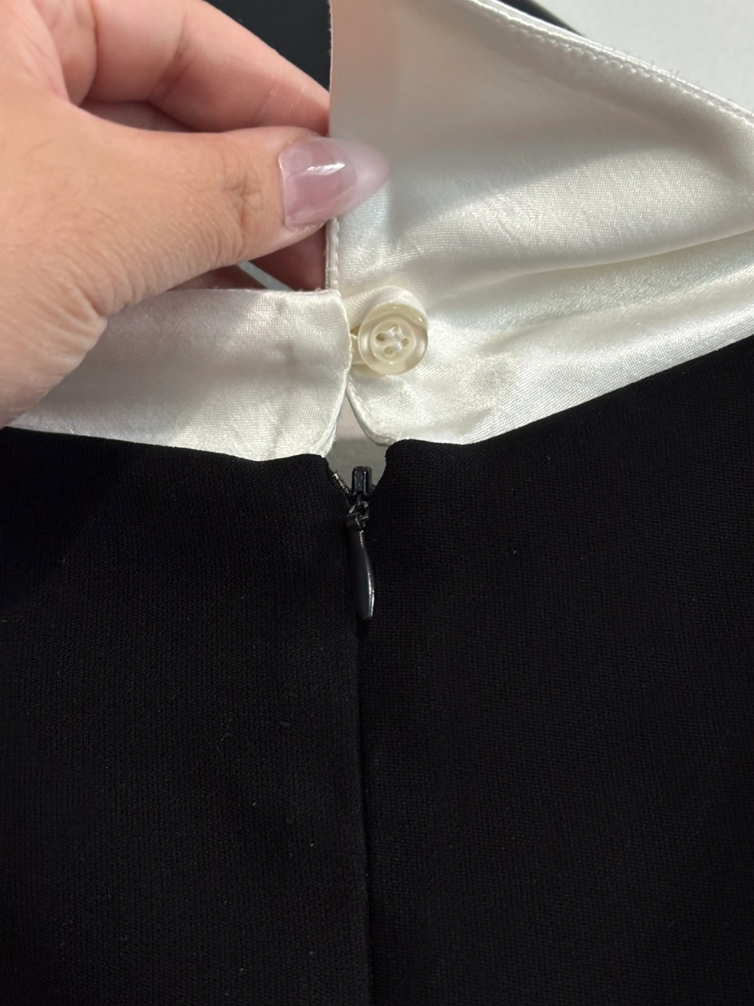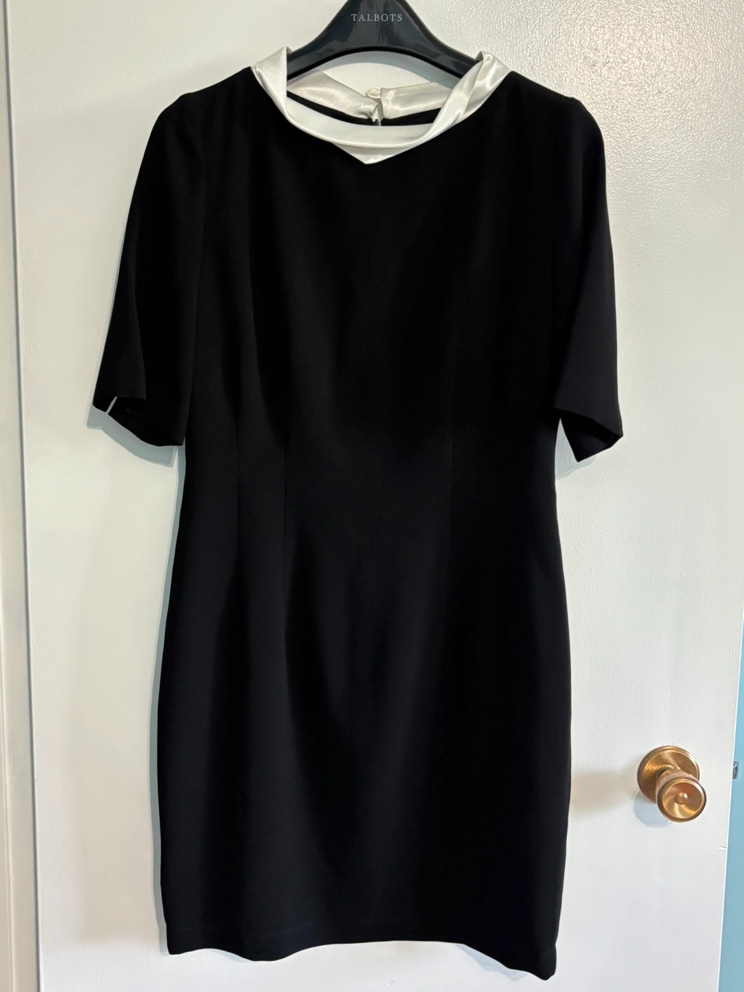 Only worn once for an event. Gorgeous black dress with a white silk collar. There’s no stretch to the dress, so make sure you’re a size 8. Comes with garment bag.