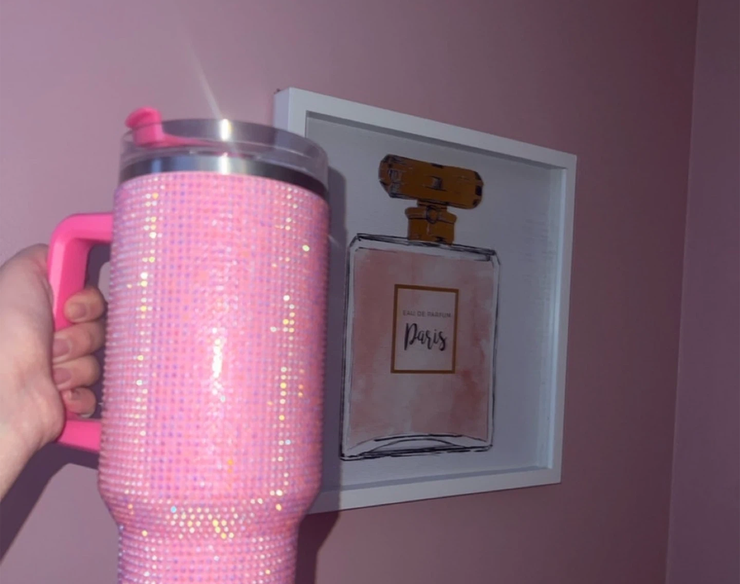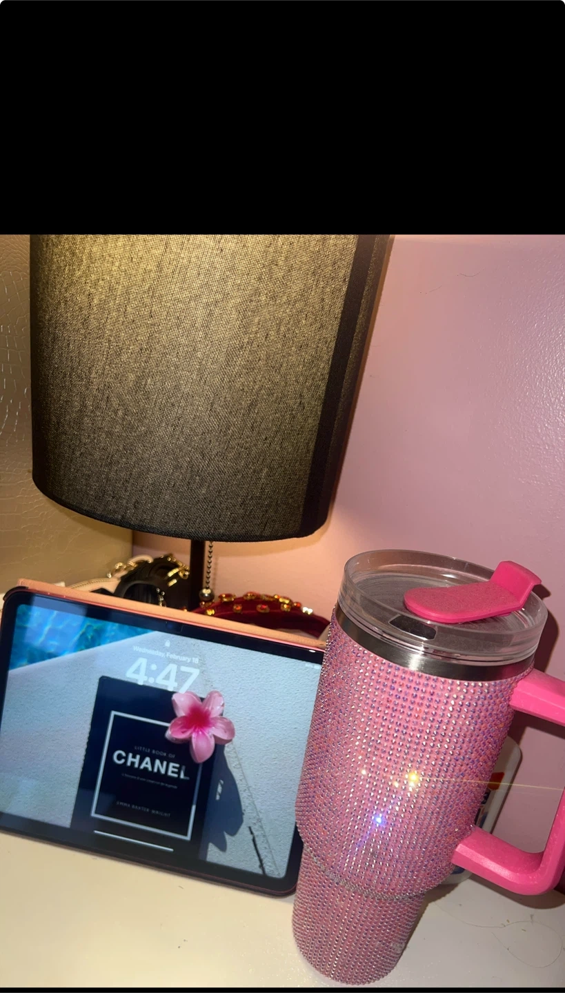 Sparkly pink tumbler covered in rhinestones and featuring a bright pink handle. It includes a clear lid and a pink straw. This insulated mug is perfect for keeping your drinks hot or cold all day!
