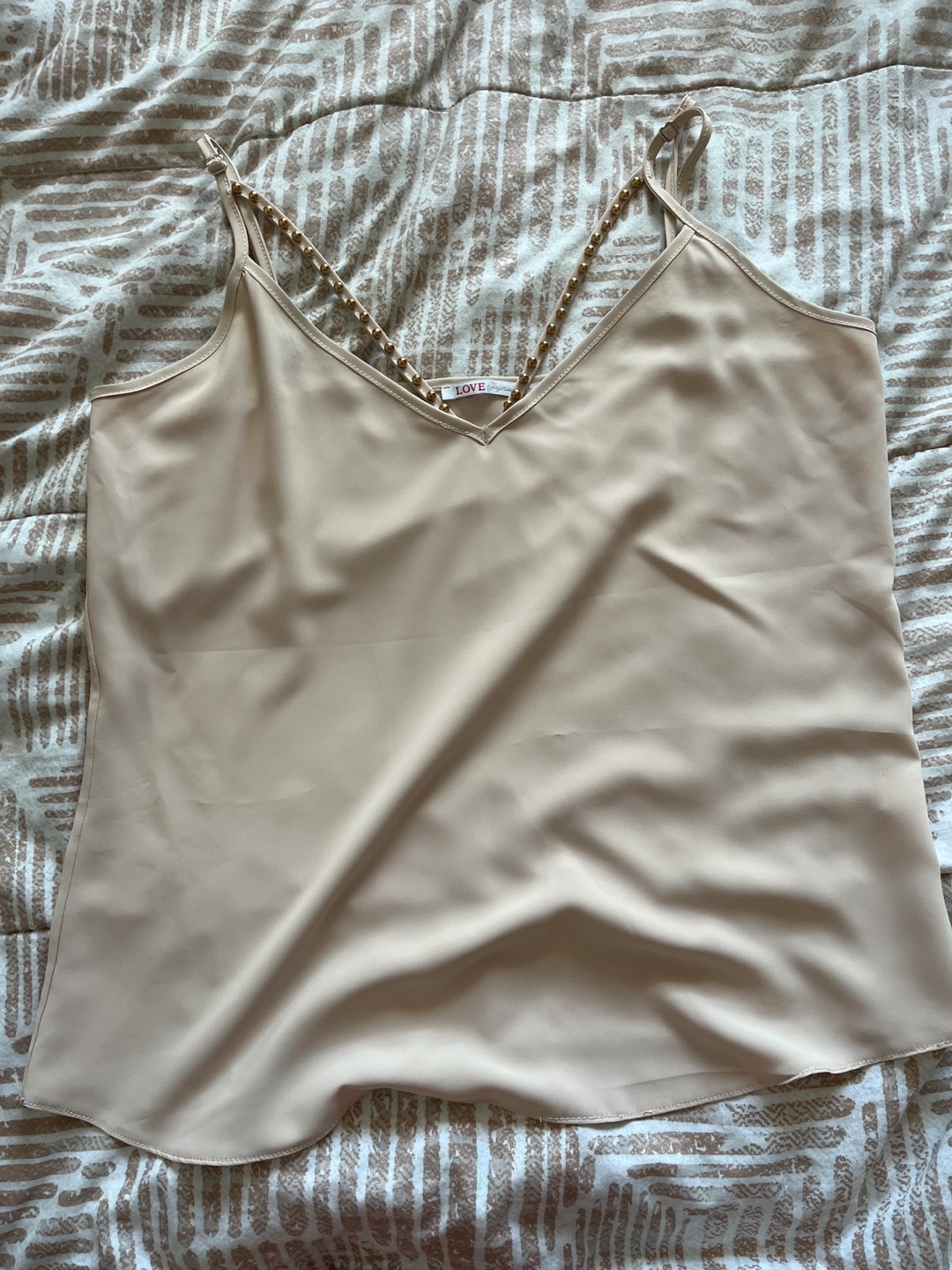 Selling a gently used LOVE Joymiss tank top in a lovely beige colour. It's a size 38. The straps have gold studs, adding a touch of elegance! Perfect for a casual or dressed-up look.