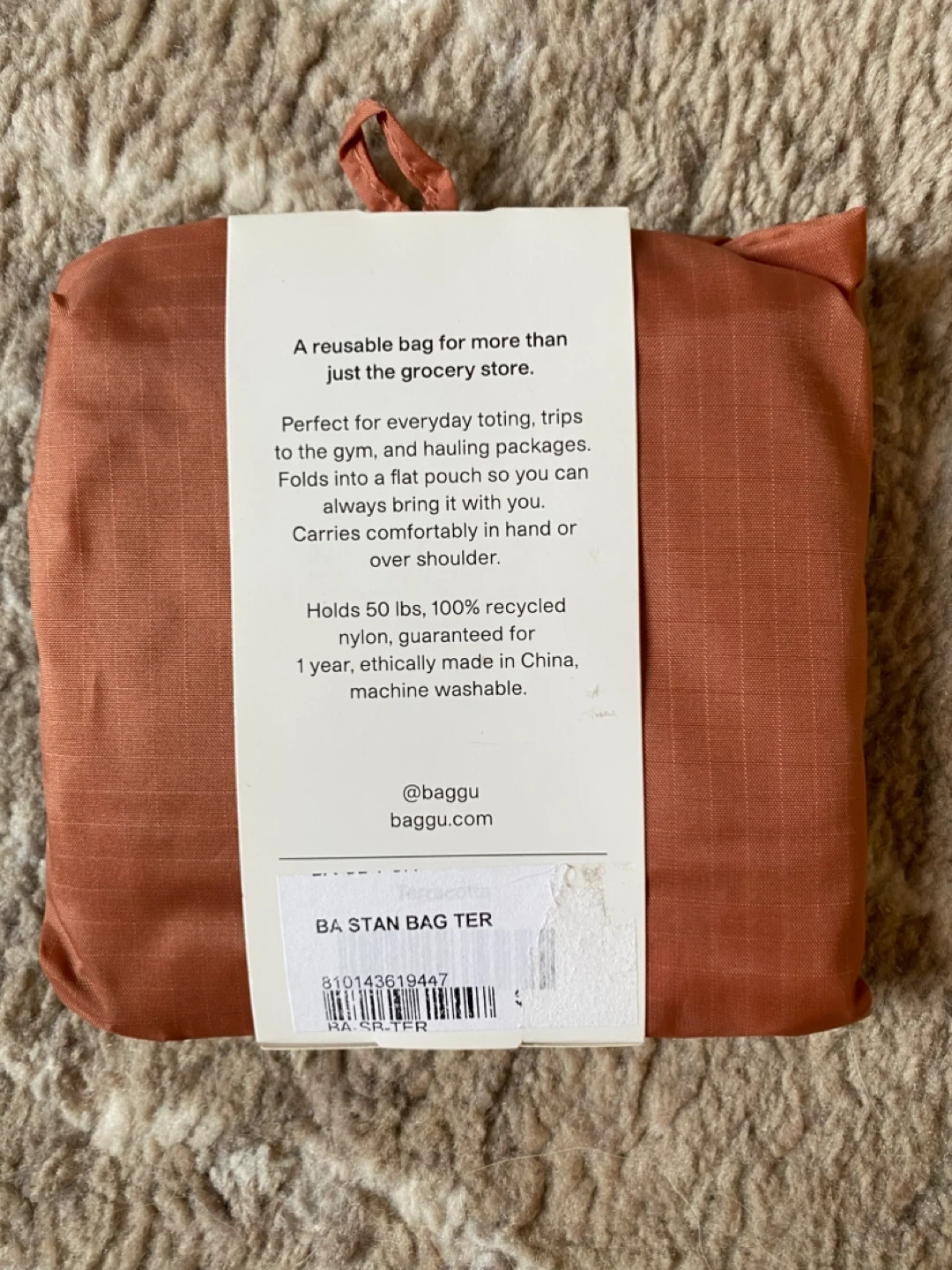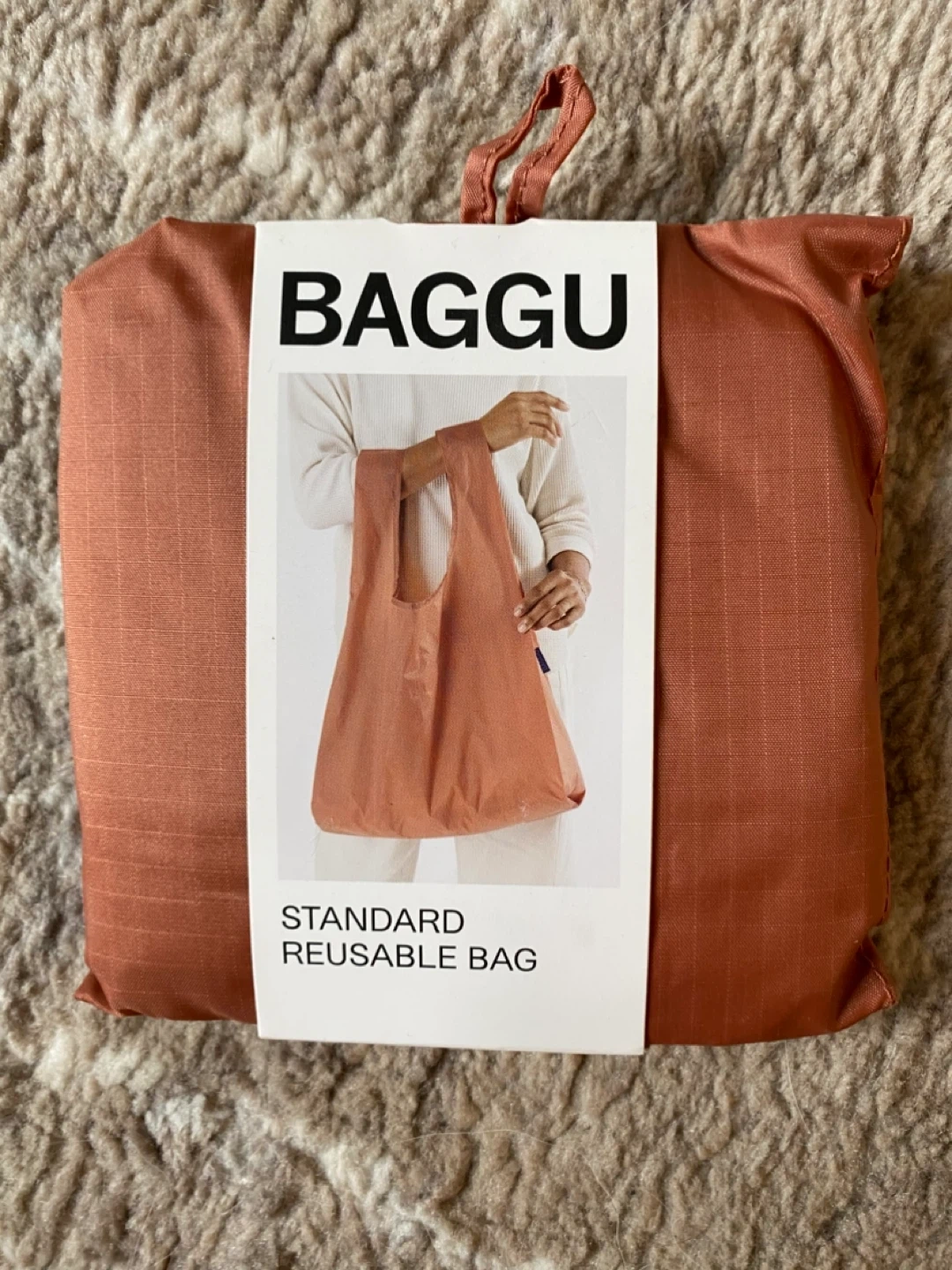 Selling a Baggu standard reusable bag in terracotta. It's perfect for everyday toting, trips to the gym, and hauling packages. Folds into a flat pouch so you can always bring it with you. Carries comfortably in hand or over shoulder. Holds 50 lbs, 100% recycled nylon.