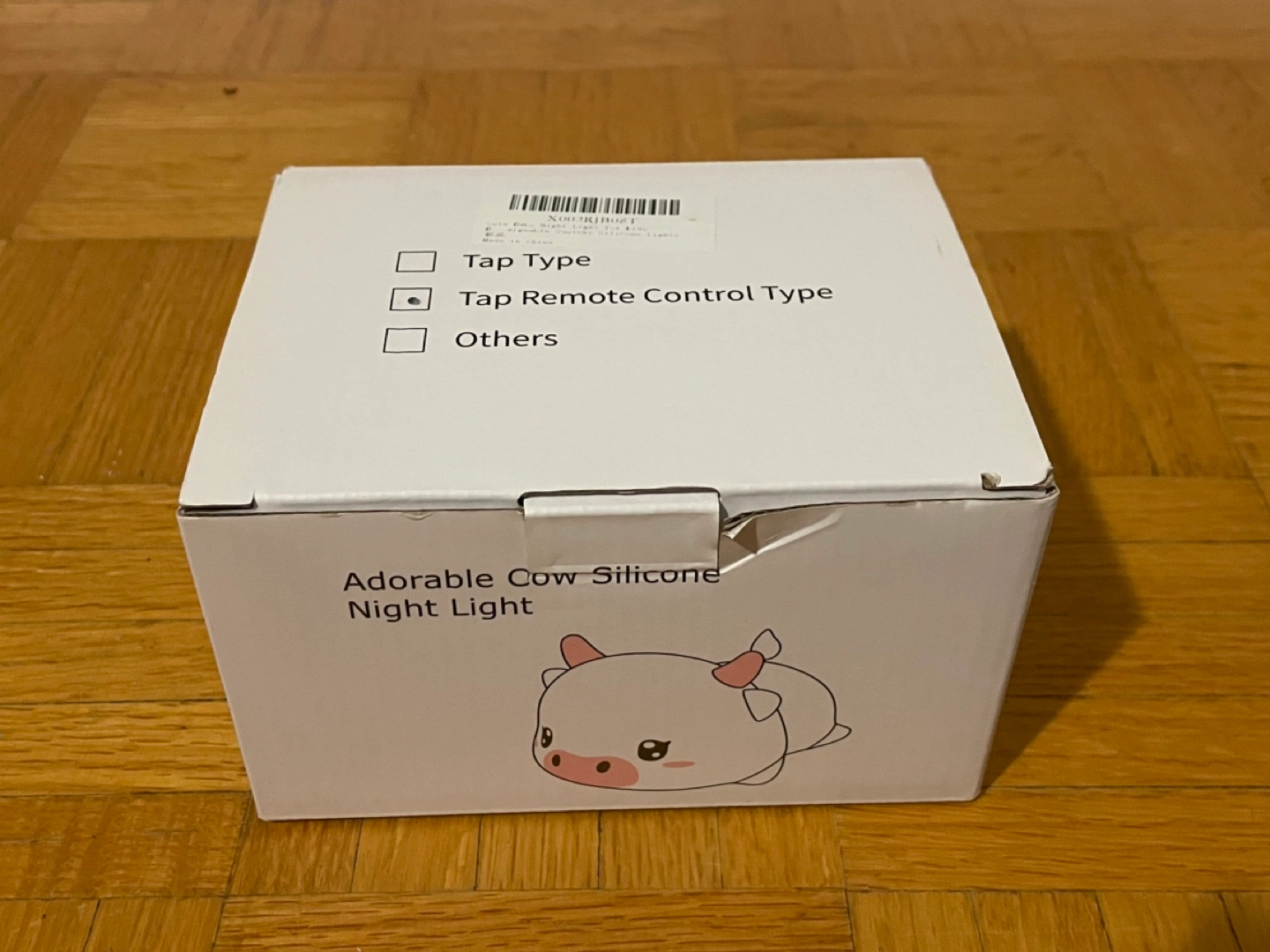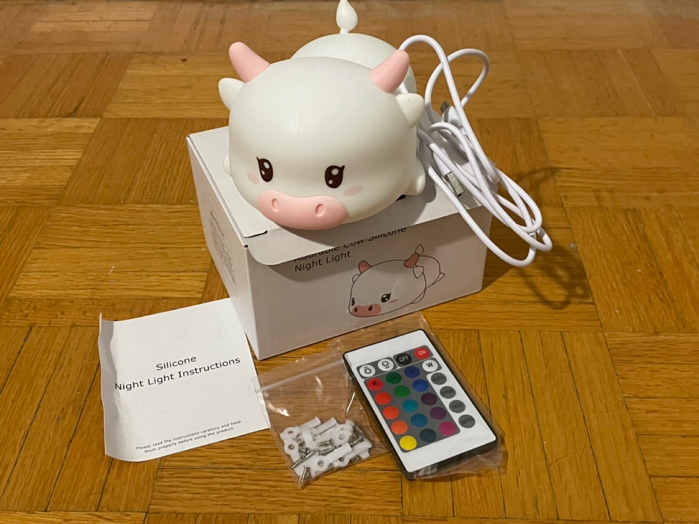 Cute cow-shaped silicone night light. USB rechargeable. Colour changing. Includes remote control and mounting hardware. New in box.