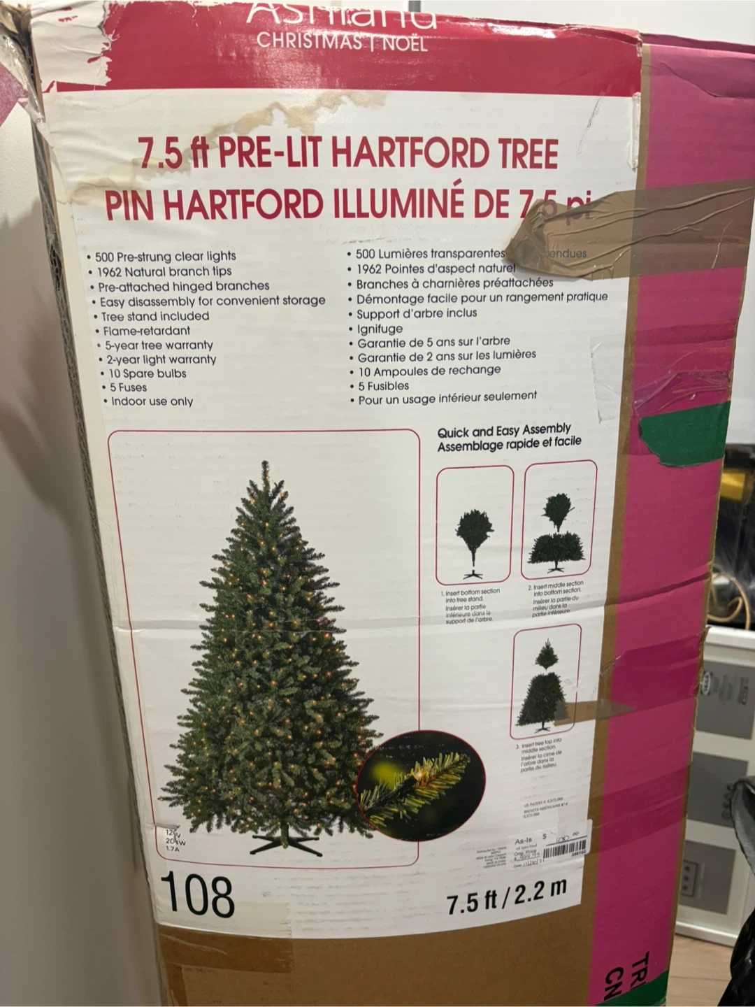 19Selling a 7.5 ft Hartford Christmas tree. It comes with: - 1962 Natural branch tips - Pre-attached hinged branches - Easy disassembly for convenient storage - Indoor use only - tree stand included - some lights are not working anymore so I used different one last year Quick and easy assembly!