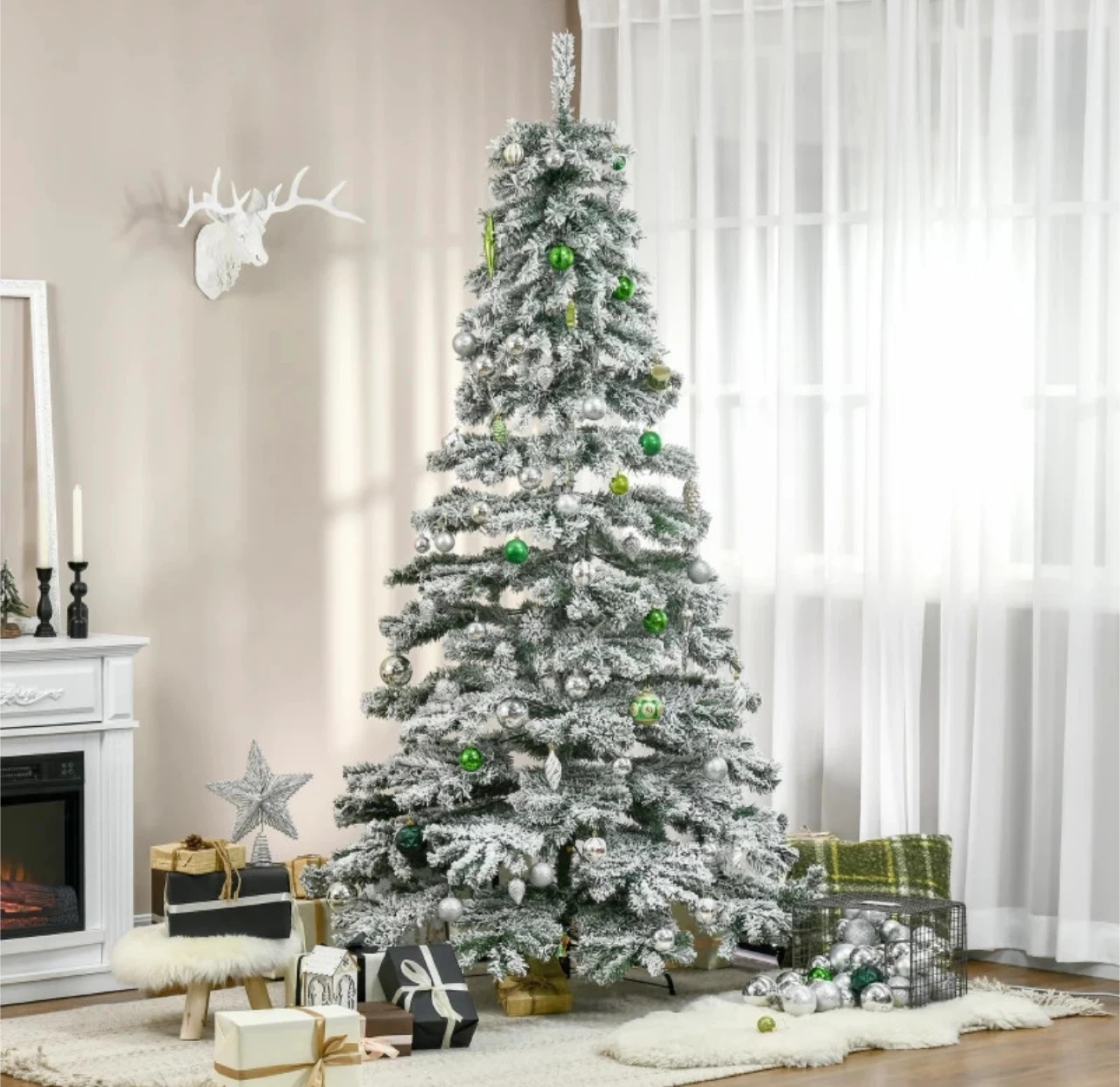 7.5ft Artificial Snow Flocked Christmas Tree Xmas Tree Holiday Home Indoor Decoration for Party with Foldable Feet, Green NEW IN BOX : Overall Dimension: 55.1" L x 55.1" W x 88.6" H (140 x 140 x 225 cm), Tree Height: 7.5ft. Please note: In order to get a full appearance, please insert each individual tip and spread it out to get the best possible look from the tree, suggest you take 40-50 minutes to shape the tree. This artificial Christmas tree with section design, detachable and collapsible feet allows for easy assembling, dismantling, and storing during the holiday off-season. A full-body, dense tree shape is provided by 1083 plentiful plastic branch tips to create a more life-like look. Ornaments are NOT INCLUDED. PICKUP IN COURTICE NEAR HWY 2 AND COURTICE RD all sales are final -321