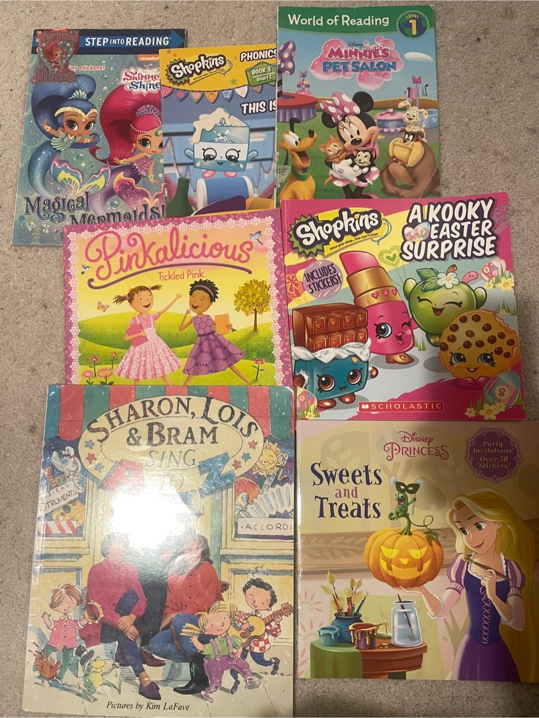 15Selling a bundle of gently used kids' books! Includes titles like Shimmer and Shine Magical Mermaids, Shopkins Phonics, Minnie's Pet Salon, Pinkalicious Tickled Pink, Shopkins A Kooky Easter Surprise, Sharon, Lois & Bram Sing, and Disney Princess Sweets and Treats! Perfect for young readers.